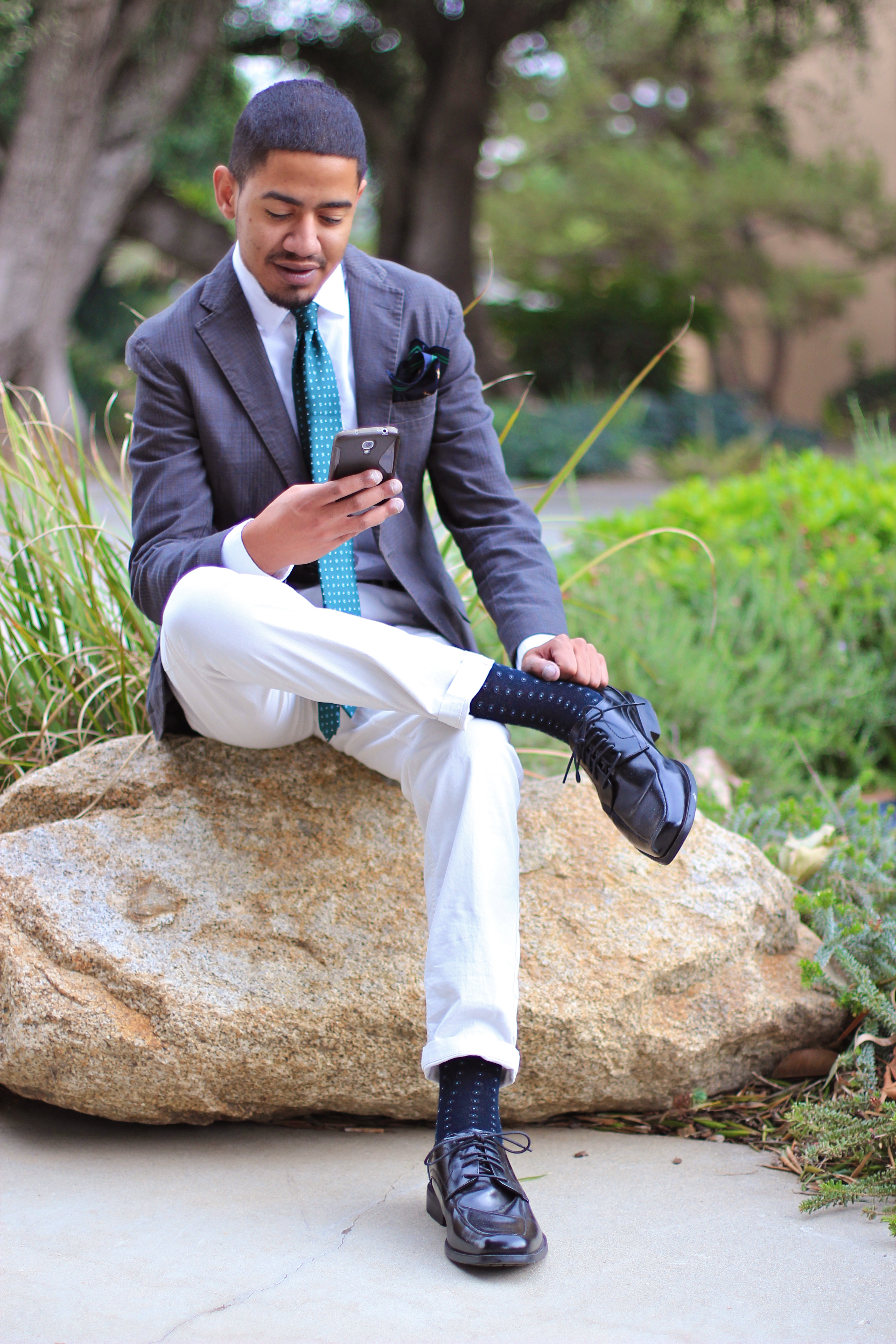 First let’s talk about the pants. Notice that they aren’t too skinny and creasing in every direction like jeans. Made of cotton, they give volume to his slim figure. This is how pants should fit; it should go straight down. Even note his patterned black socks. He doesn’t just wear plain black socks. It’s important to have sock game.