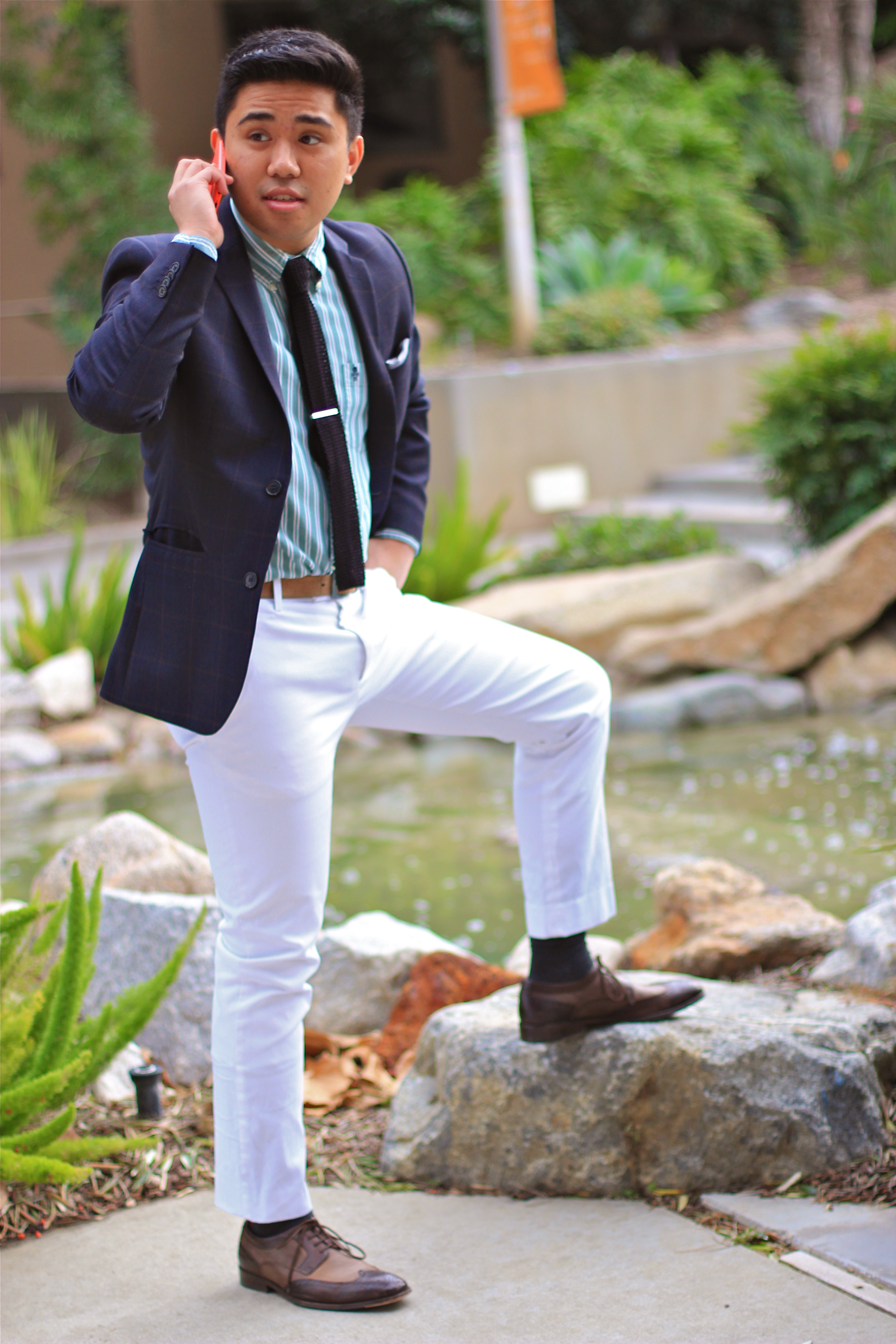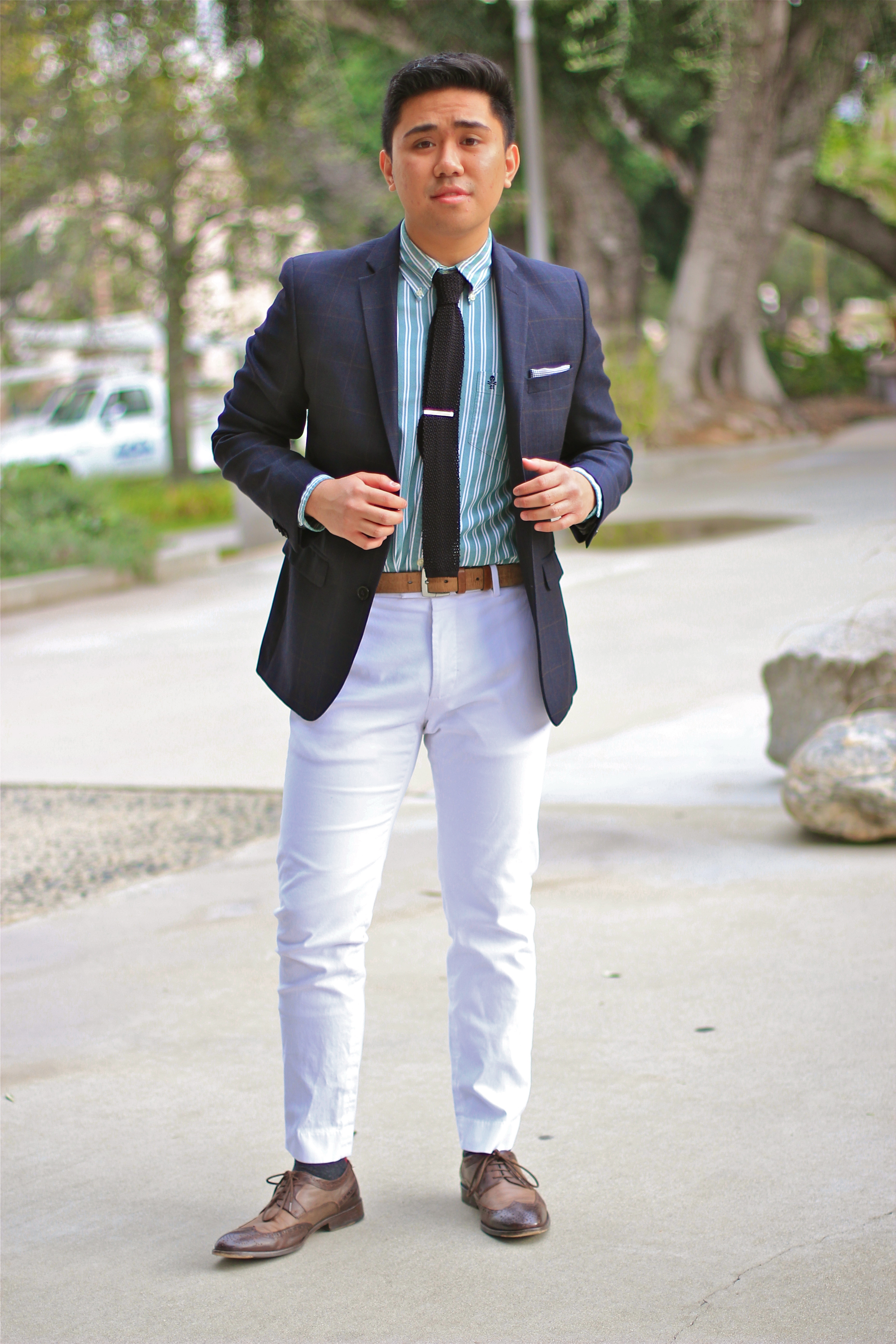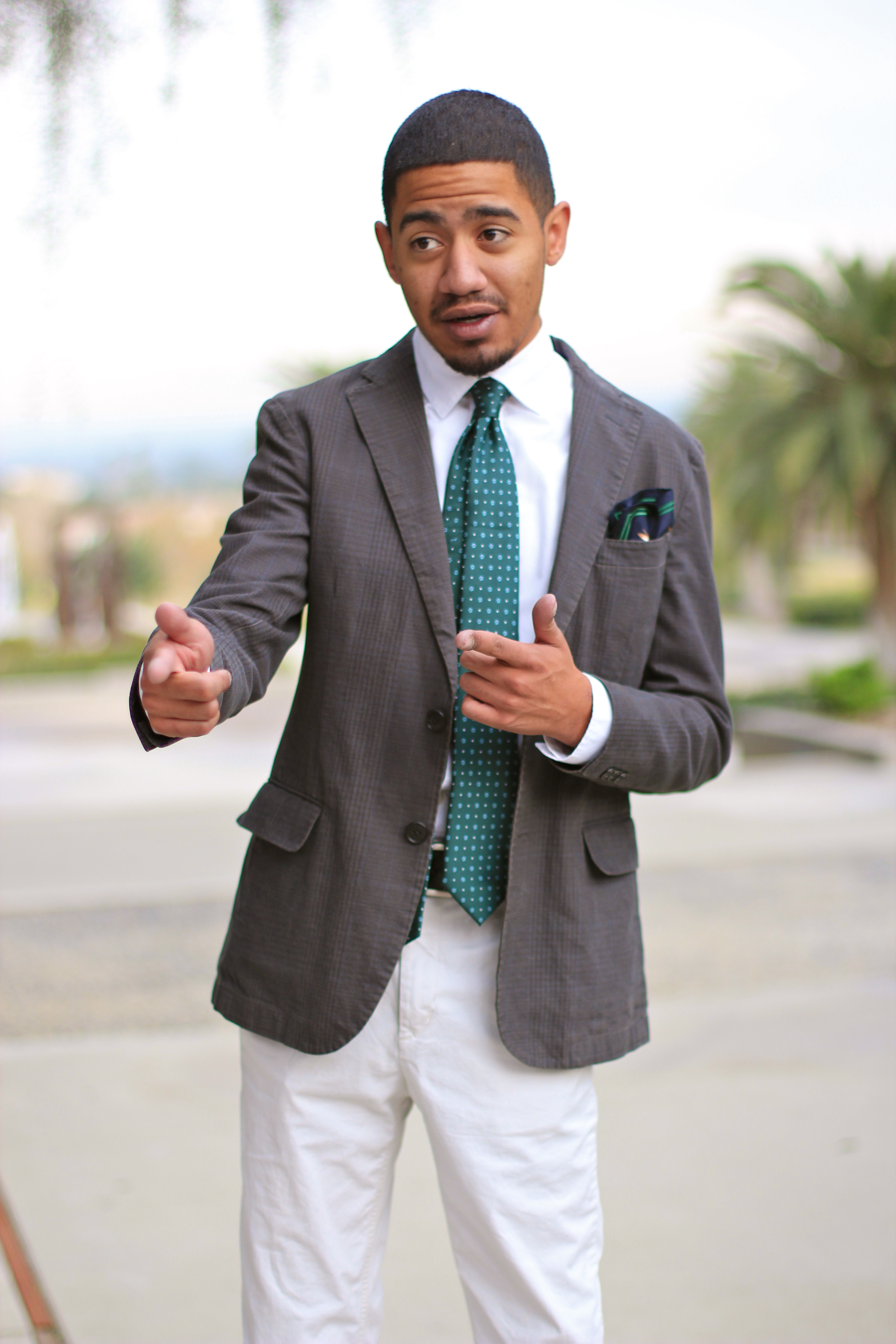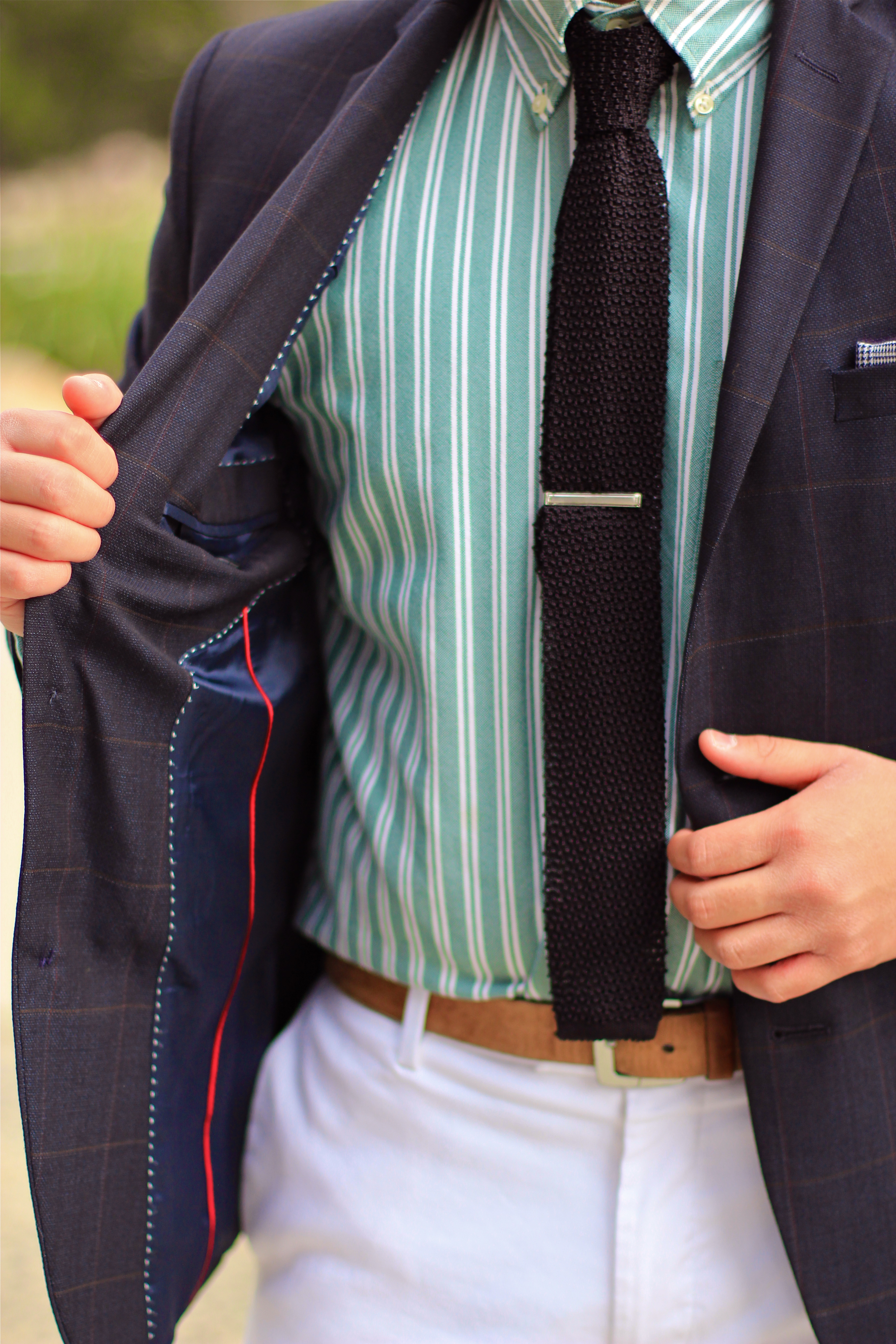Vertical lines are interesting because I honestly find them hard to match up with a tie. For this, I recommend using plain ties. The tie I chose was a silk, black knit tie which adds texture to the outfit. If you haven’t noticed, I love using texture. My shirt is a very light green and has vertical white stripes, making it a natural match to my white trousers. This is also a great shot where you can see the pattern of my jacket. It’s a very dark blue with some dark red and brown window panes. Like I said with Raj, scaling with patterns is important. The knit has a tight weave, the shirt has a medium scale of stripe, and the windowpanes on the blazer is large. It’s also interesting to note that the jacket I’m wearing is apart of a suit. You can always wear suits as separates to expand your wardrobe.