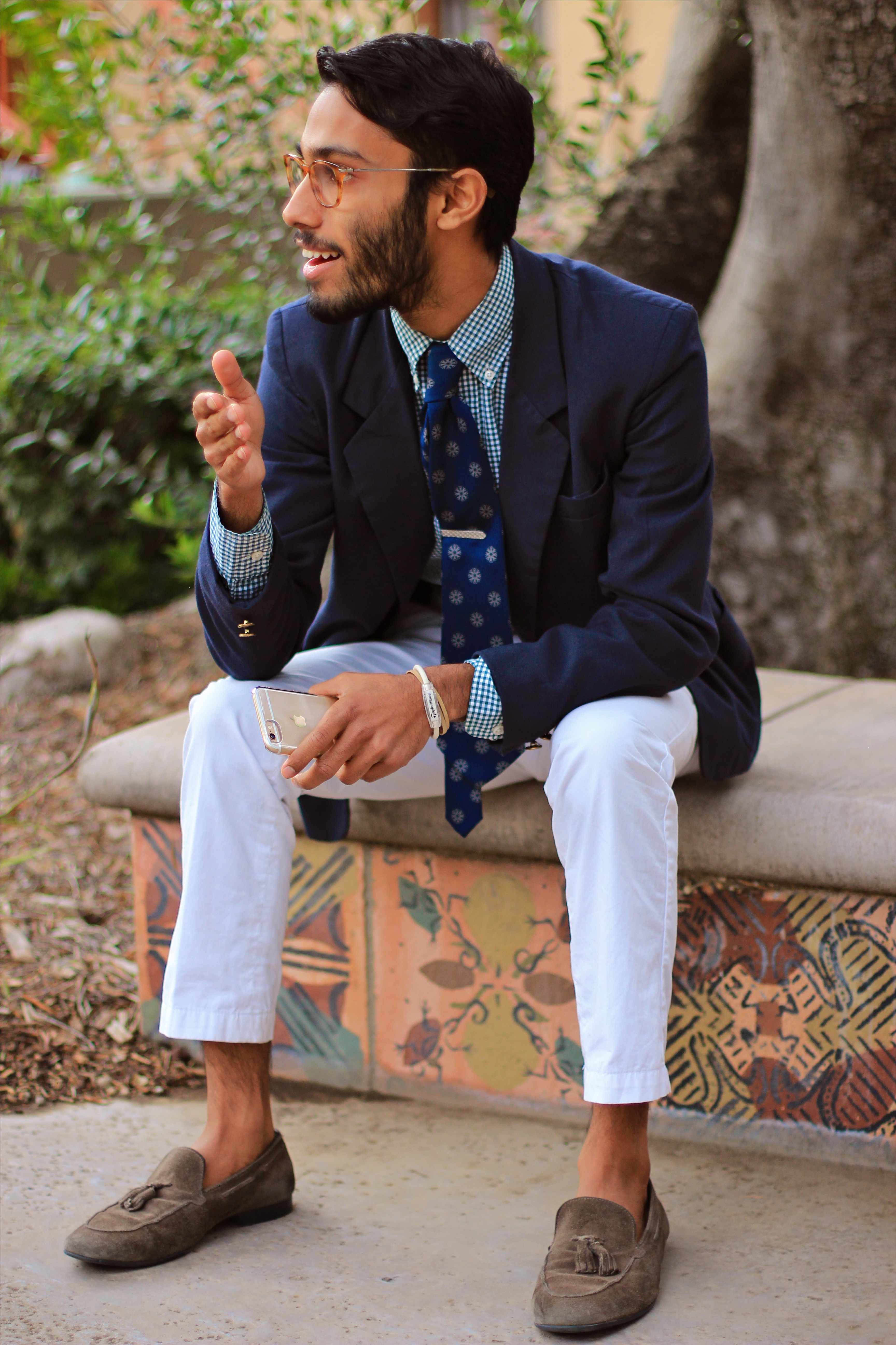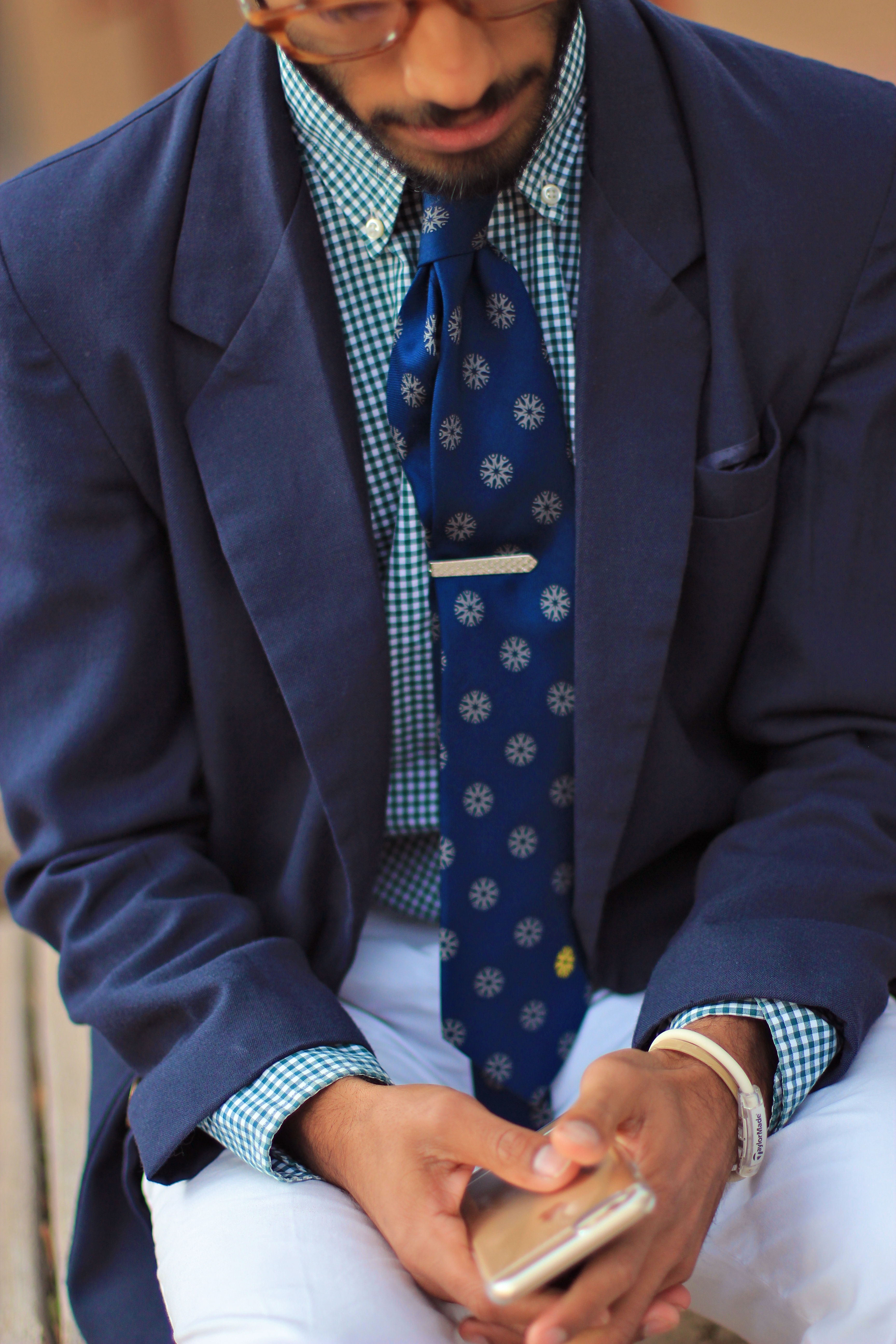 Rajesh’s button-down collar, gingham shirt is of the light green and white variety and he pairs it with our school’s necktie. Even though it isn’t a true floral pattern, it gets the job done. Notice that the patterns of the shirt smaller than the patterns on the tie; this is the key to mixing patterns in your shirt, tie, and blazer. Make sure the sizes vary. This way it won’t look so matchy-matchy or create an optical illusion.