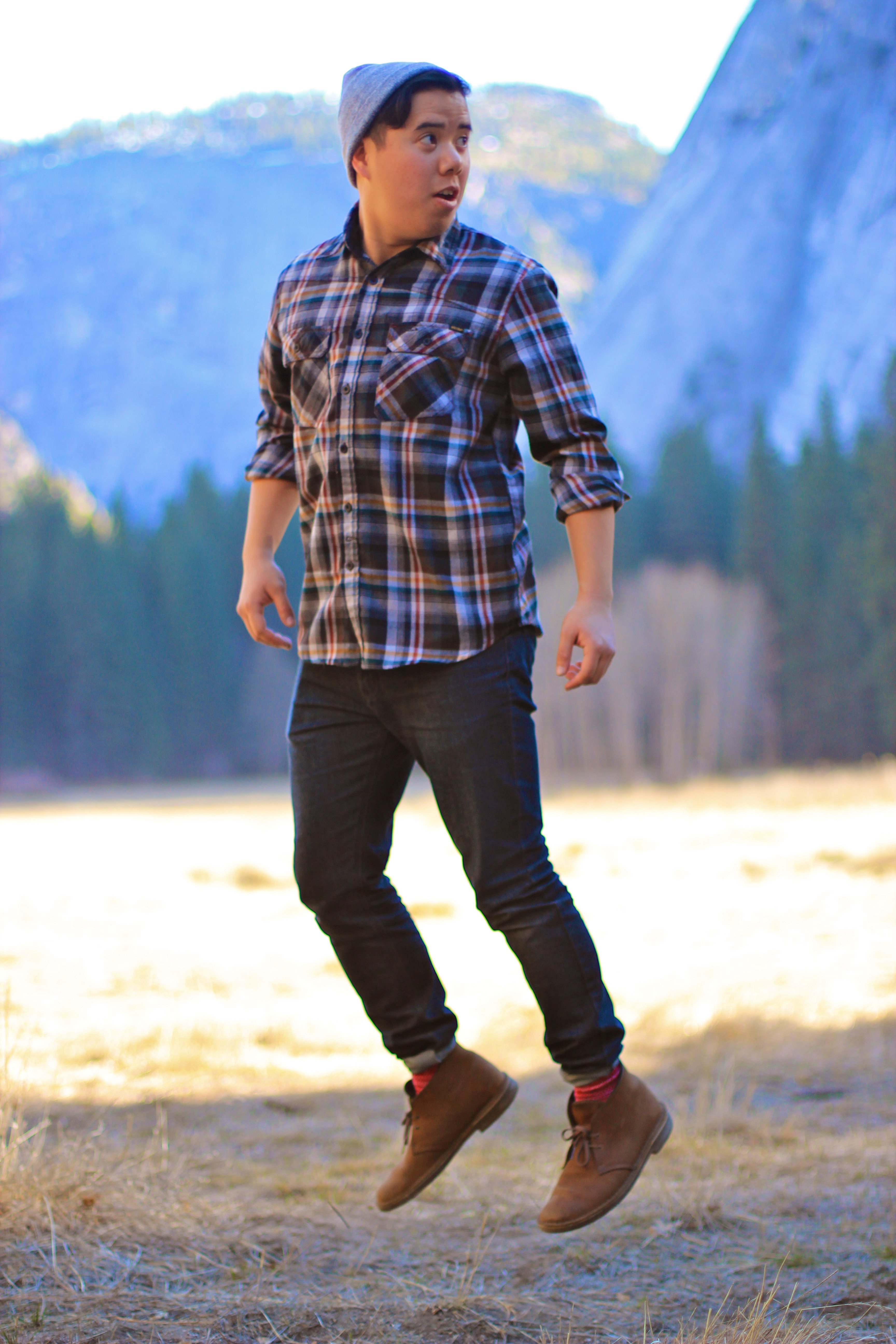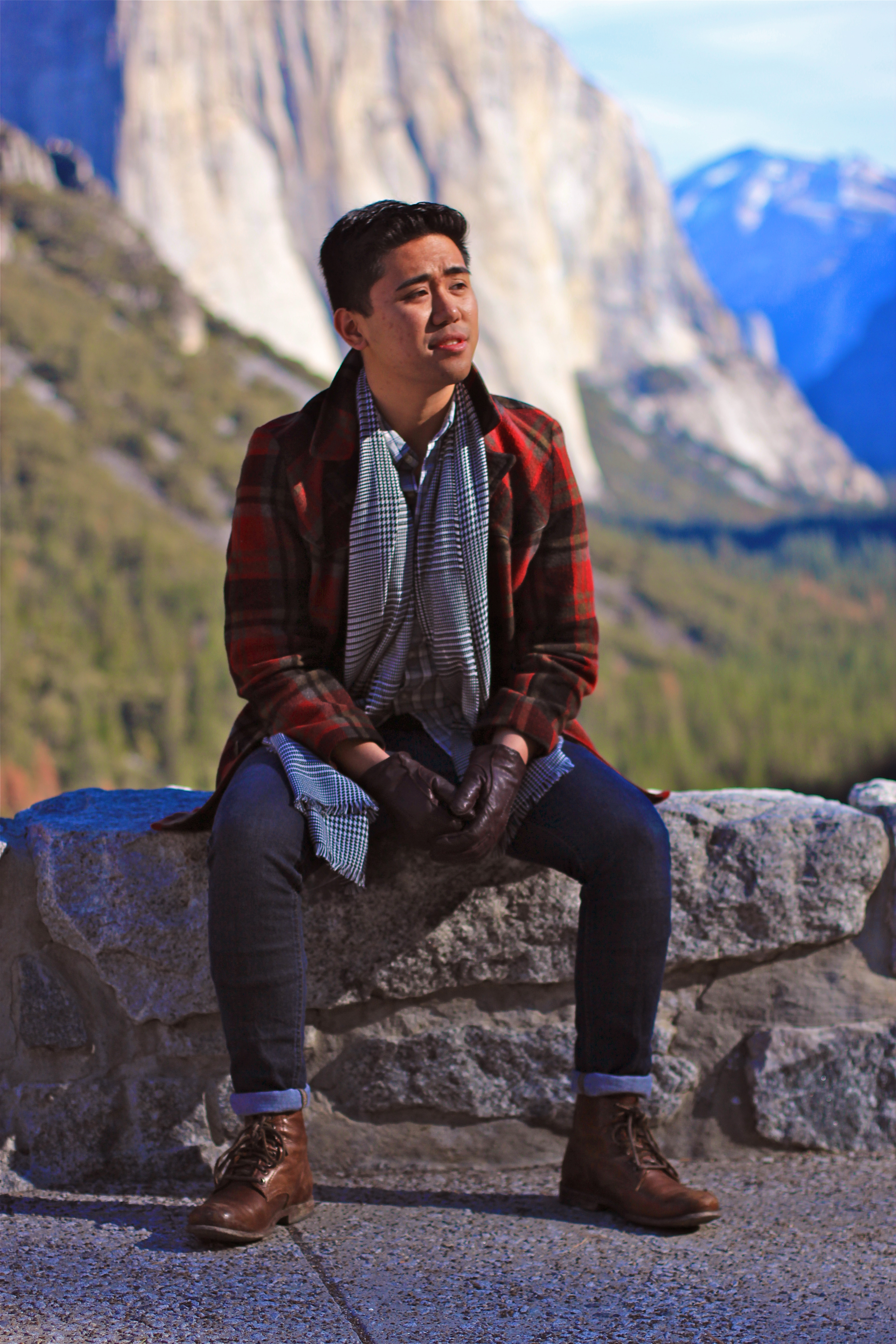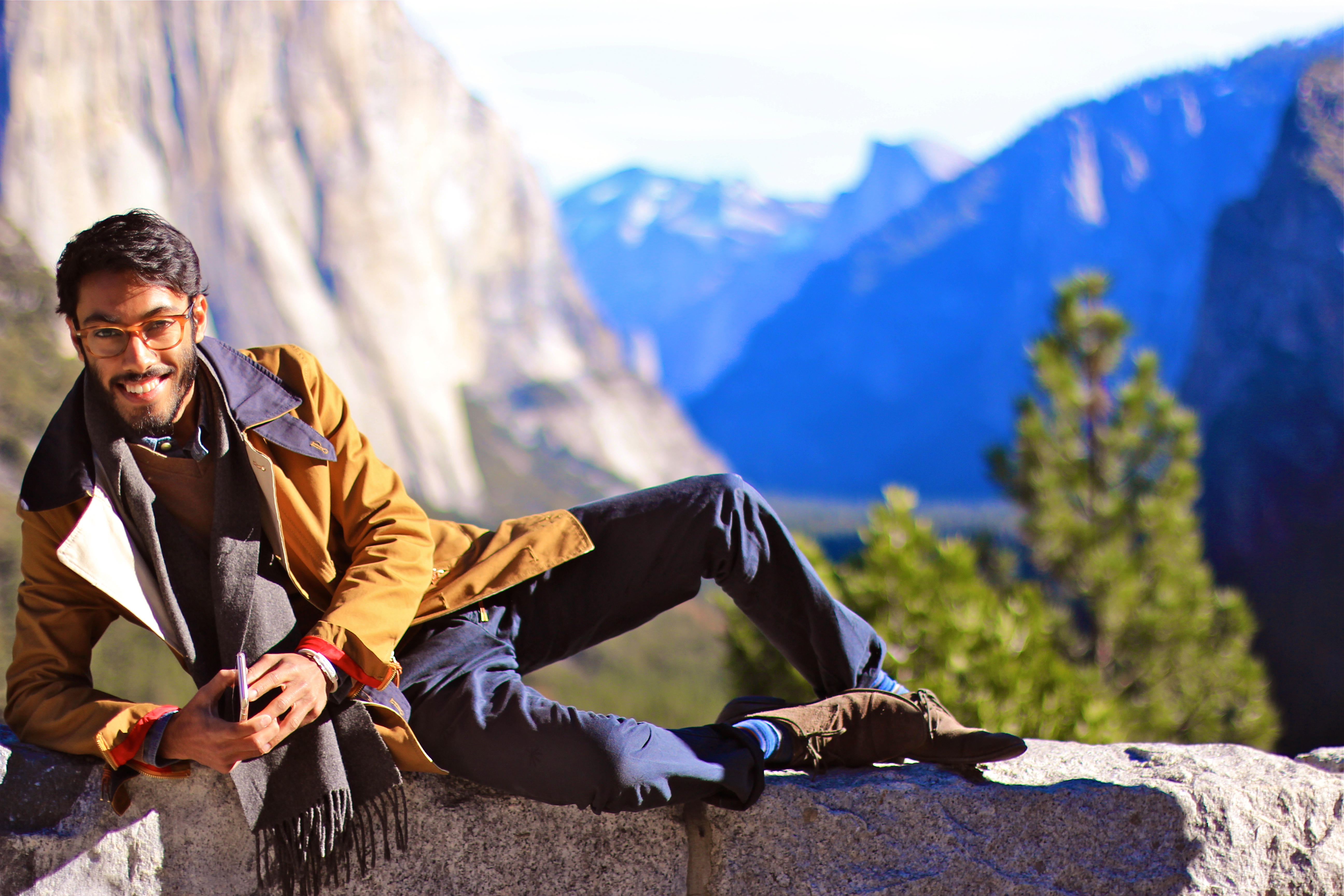 Raj keeps his look going with an amazing trench-coat-esque jacket.  The dark mustard color definitely make him stand out among the green utility jacket’s people kept wearing.  Underneath, he maintains that “prep” style that he loves with a brown wool sweater over a chambray shirt (a staple for all menswear) and blue pants.  The day that we wore this outfit, we were scheduled to hike in the Yosemite Valley, but Raj wouldn’t have it.  Because he was staying behind, he wore comfortable suede shoes; They add character because they are his “whatever shoes”.  Being beat up and aged, they can be worn with anything.  His socks, while colorful and add the most pop to his outfit, echo the striped pattern of the previous outfit.