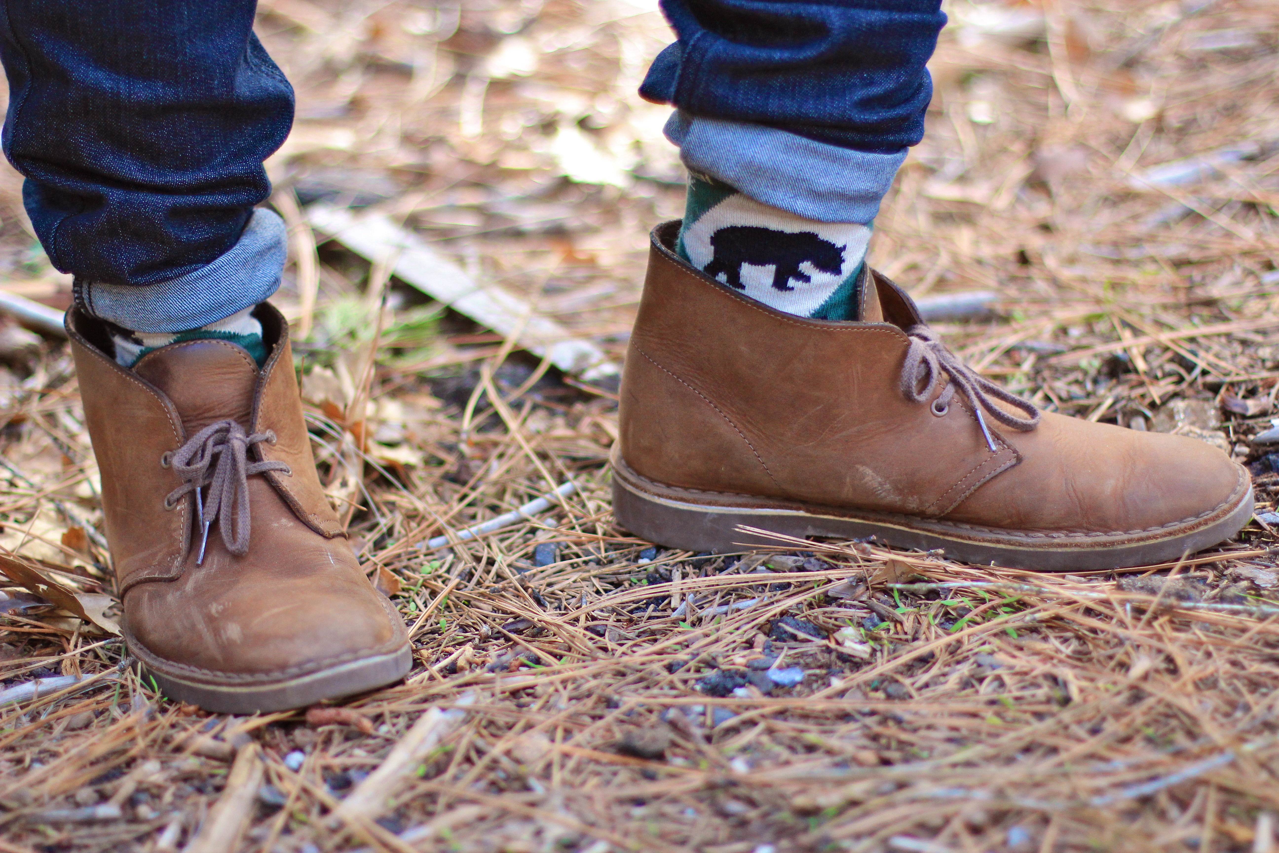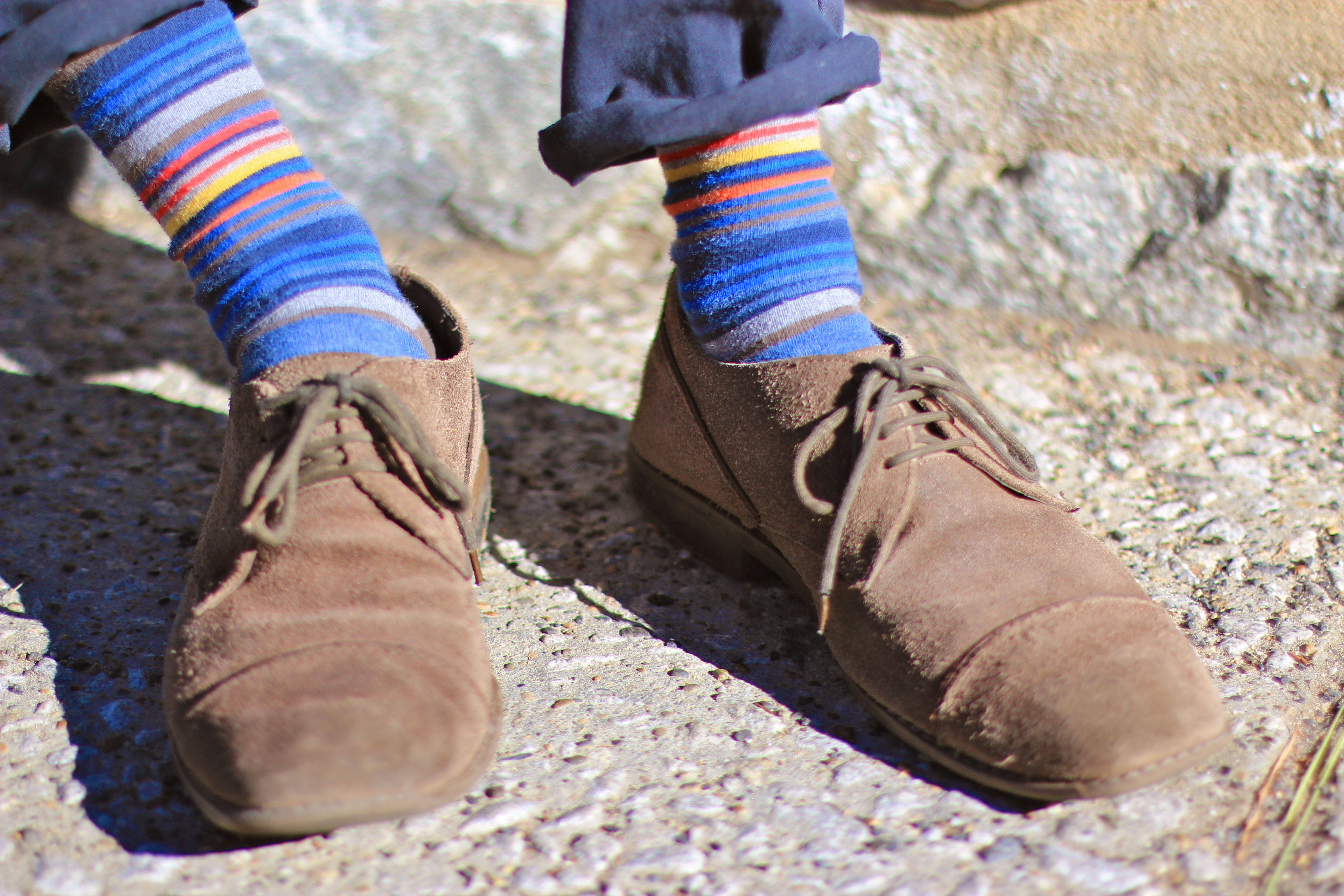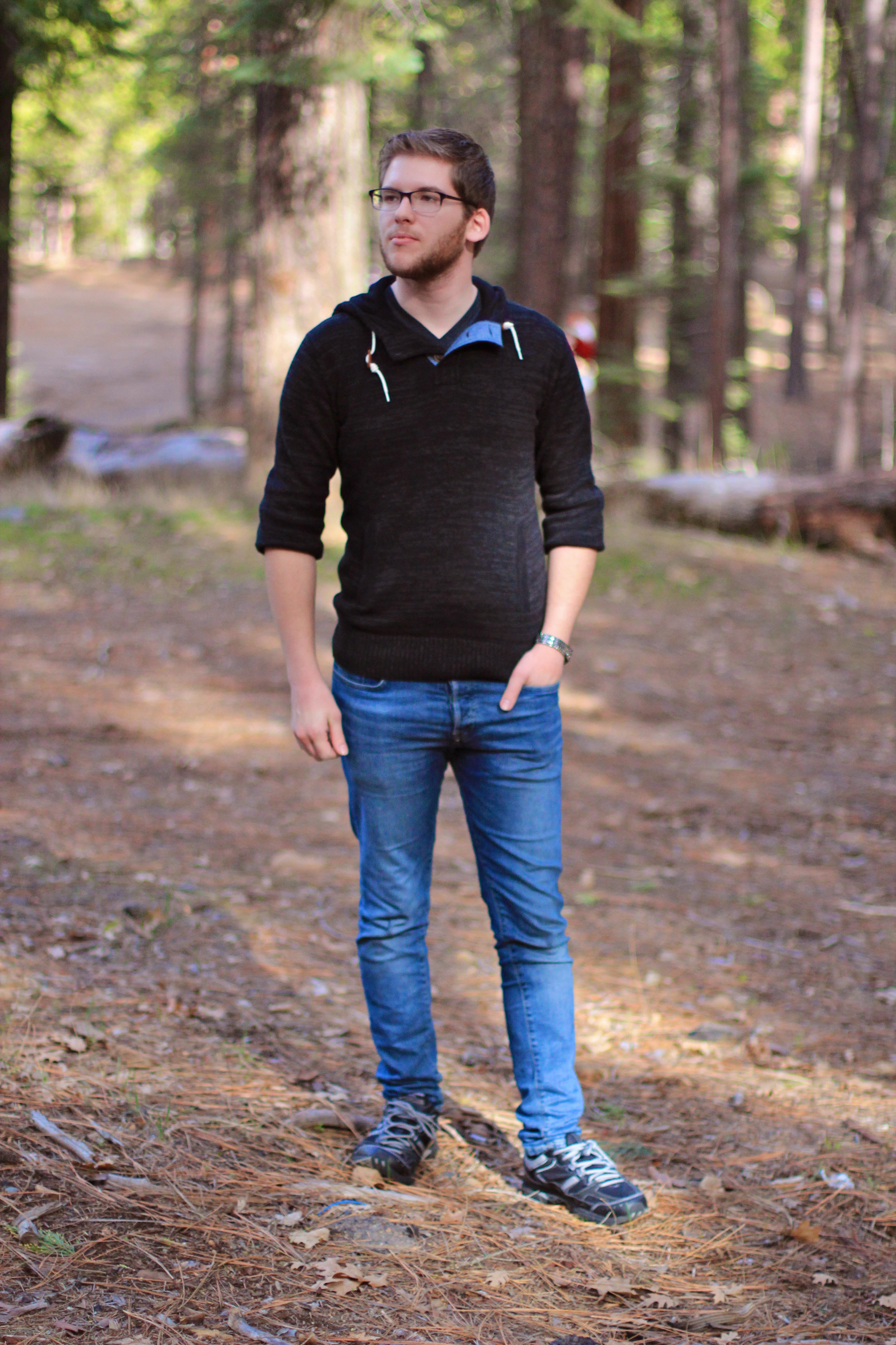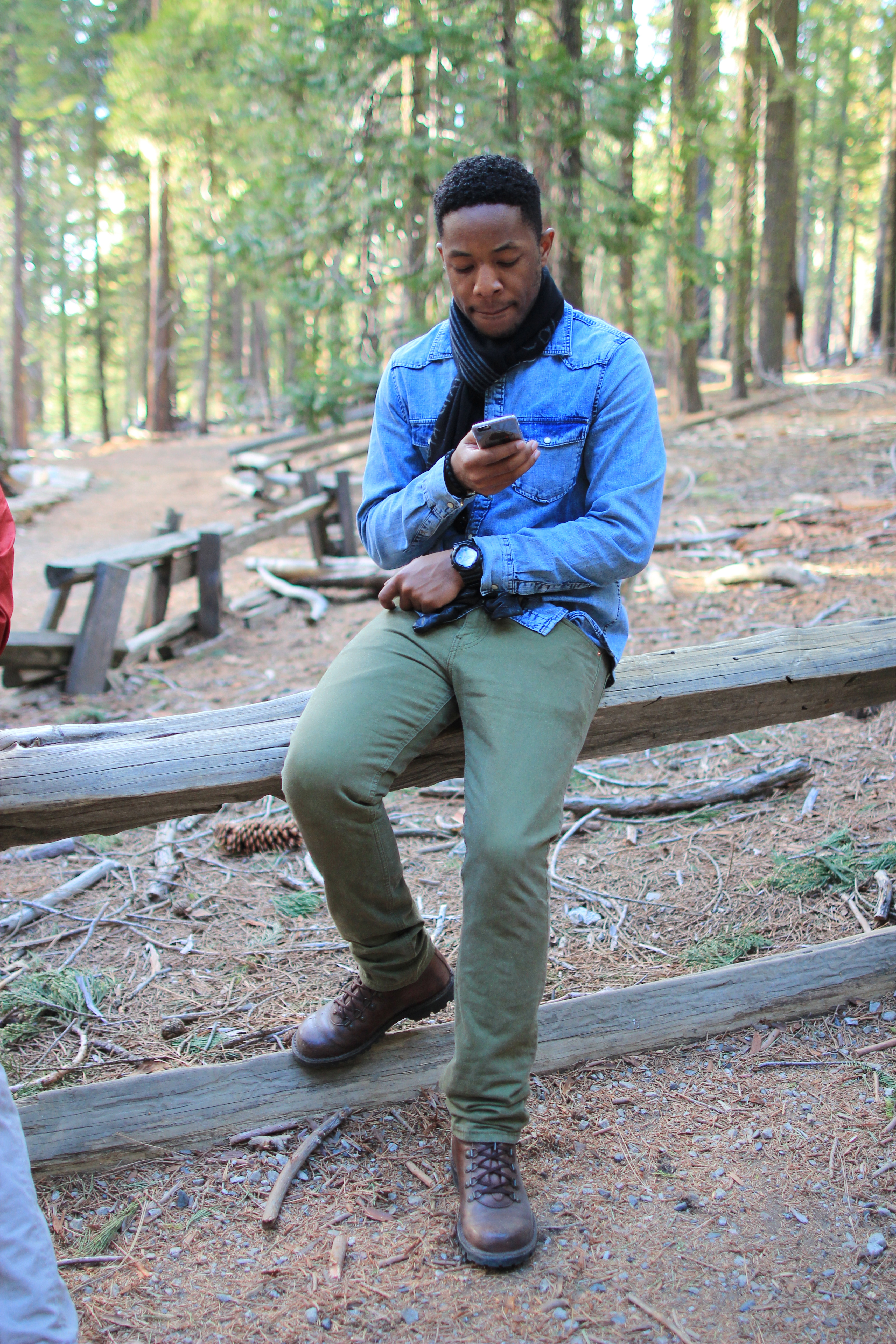 Raj keeps his look going with an amazing trench-coat-esque jacket.  The dark mustard color definitely make him stand out among the green utility jacket’s people kept wearing.  Underneath, he maintains that “prep” style that he loves with a brown wool sweater over a chambray shirt (a staple for all menswear) and blue pants.  The day that we wore this outfit, we were scheduled to hike in the Yosemite Valley, but Raj wouldn’t have it.  Because he was staying behind, he wore comfortable suede shoes; They add character because they are his “whatever shoes”.  Being beat up and aged, they can be worn with anything.  His socks, while colorful and add the most pop to his outfit, echo the striped pattern of the previous outfit.