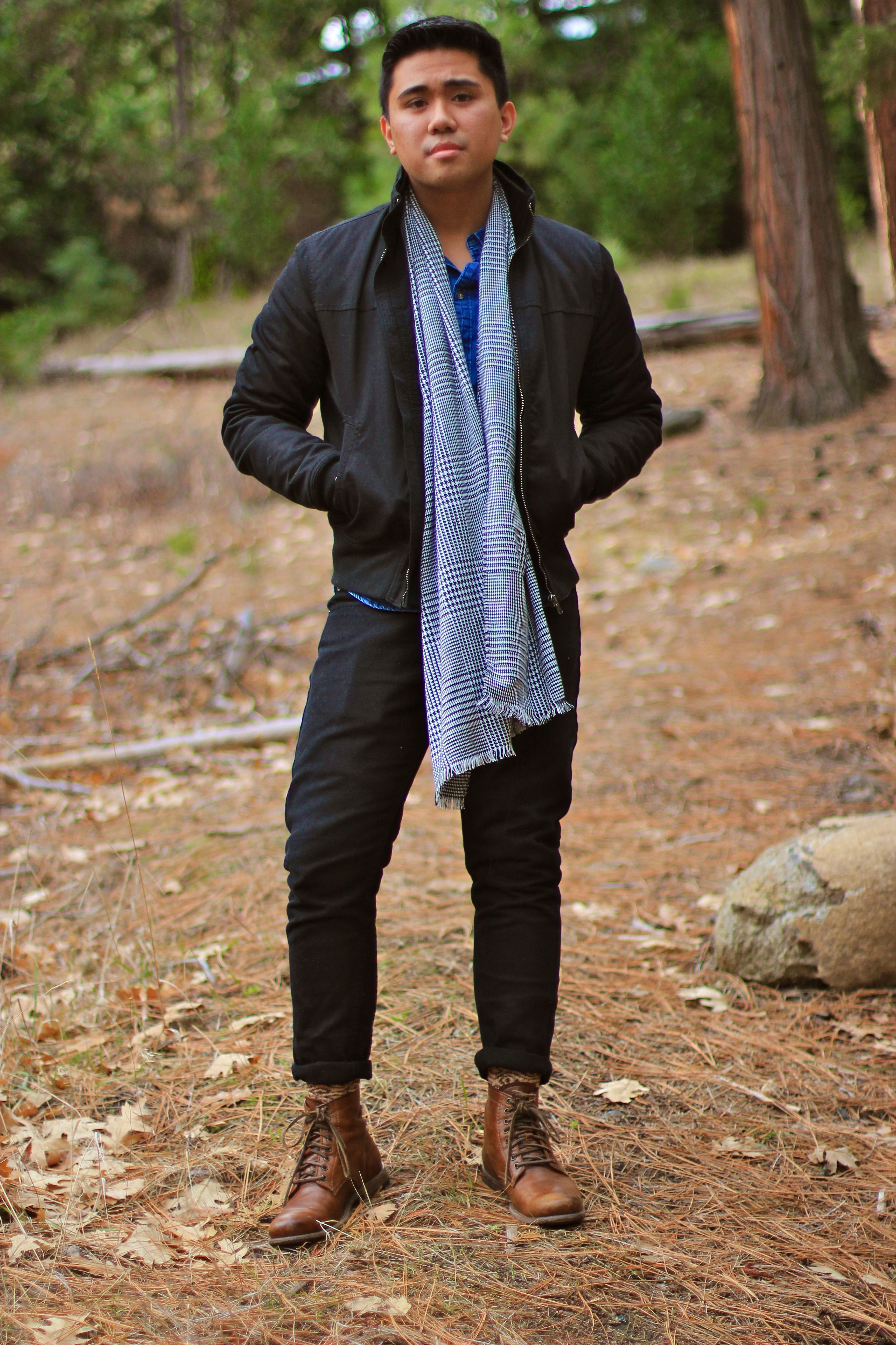 I kept in the scarf and the boots, but changed the shirt and pants.  The shirt is a flannel gingham shirt that is a muted grey as to not take away from the color of the jacket.  For the jeans, they are simple; blue and cuffed up to play on that lumberjack look.