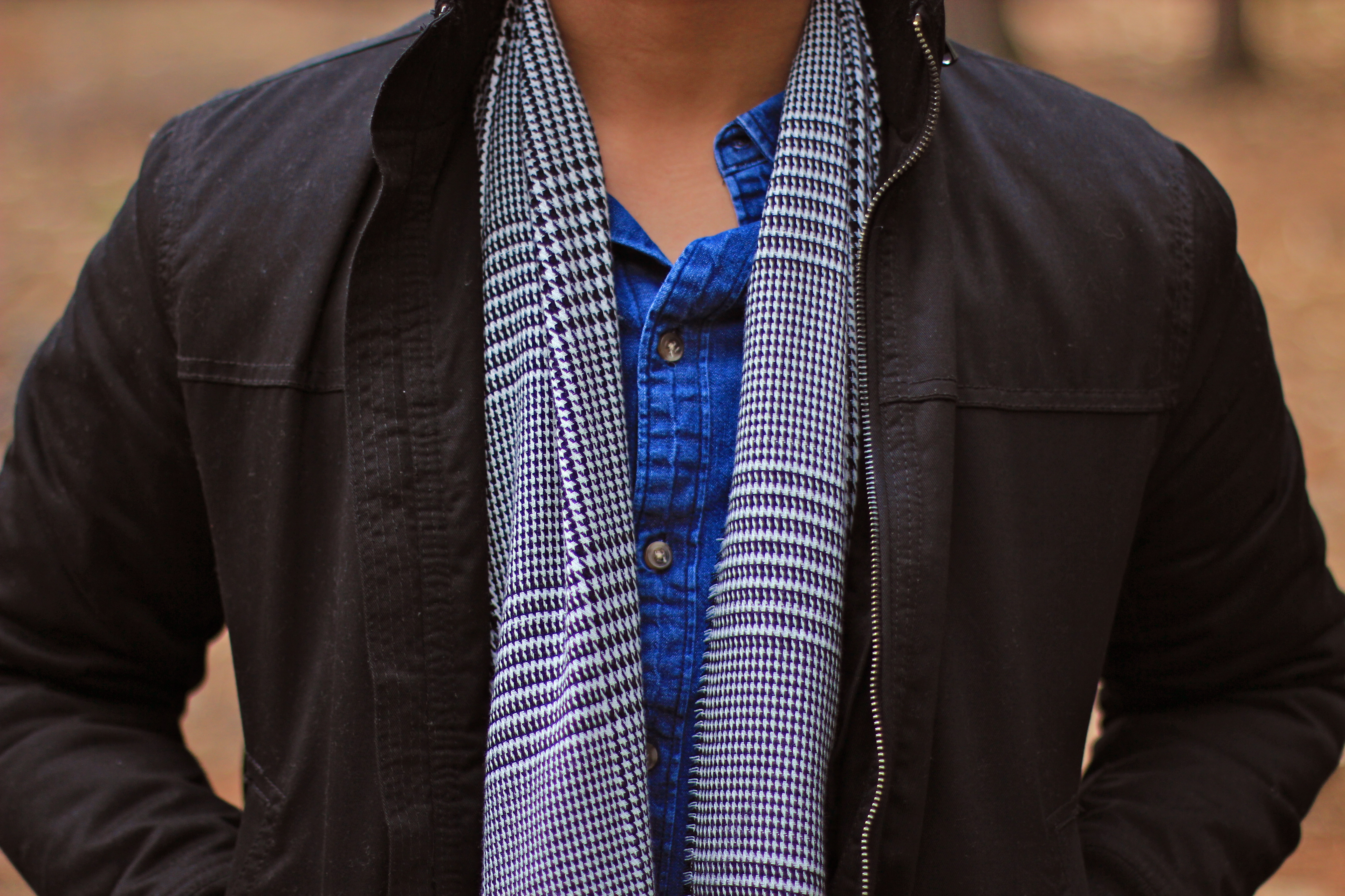 Denim Shirt from H&M, Black jacket from H&M, Herringbone Scarf from H&M