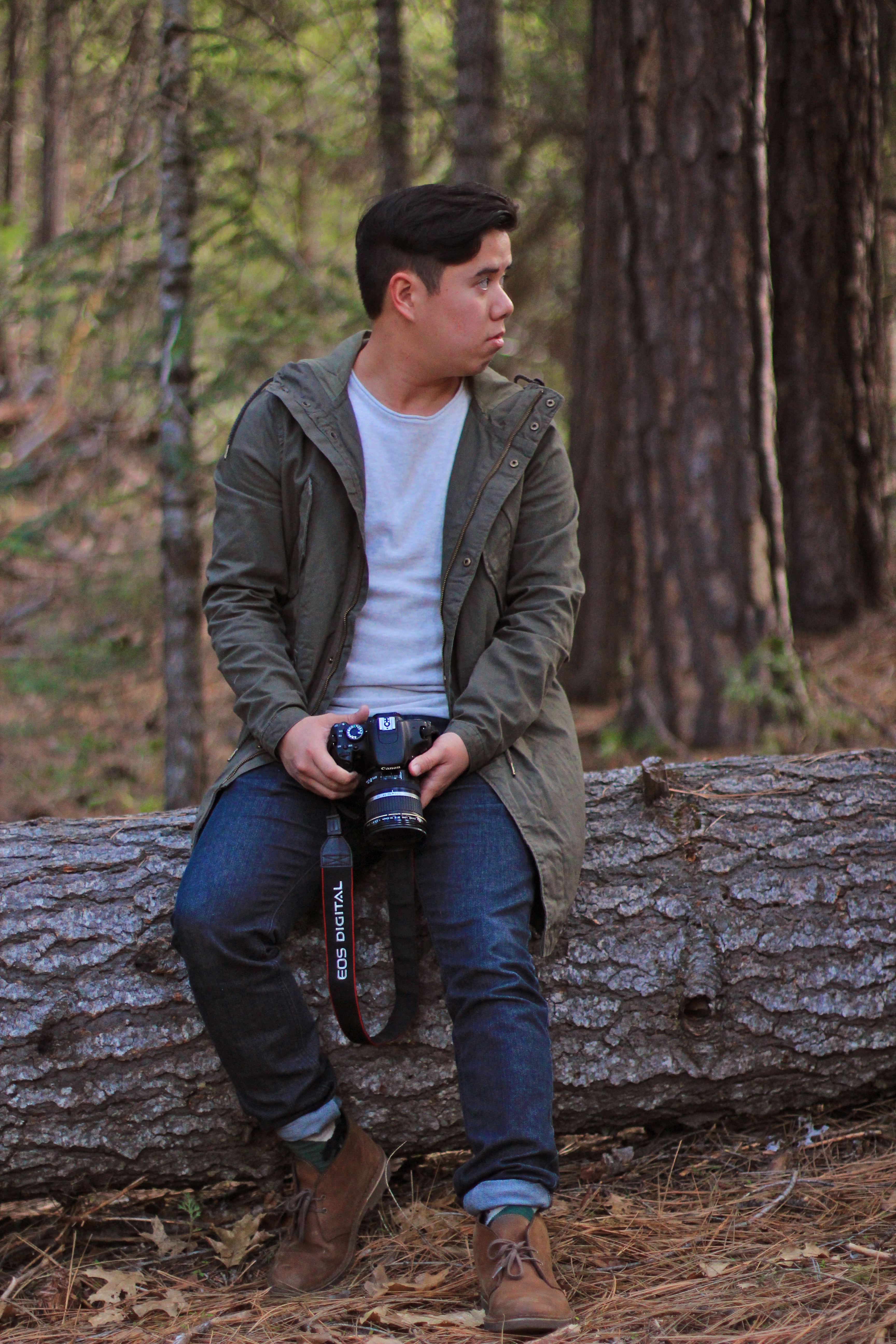 Yeah, plaid and jeans (plus a forest) basically makes you look like a lumberjack.  However, Tim’s lumberjack look looks different than mine due to the fact that his plaid is in the form of a muted shirt.  This style of shirt, with the dual breast pocket, is favored by skaters and is a bit of a staple for menswear.  His light beanie grounds the outfit in grey, yet adds enough contrast so that he’s not monochromatic.  If you haven’t noticed, being monochromatic is a bad thing.