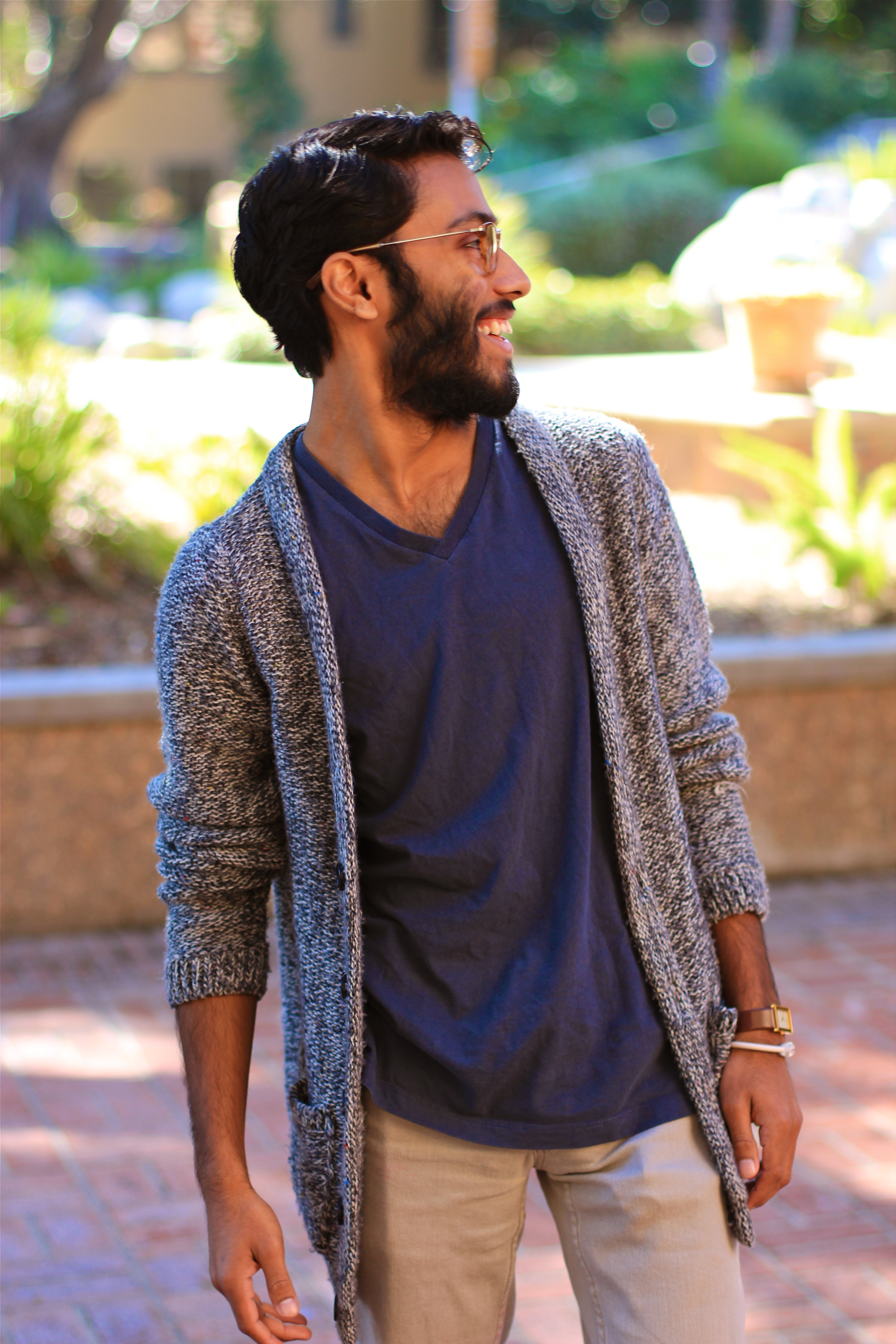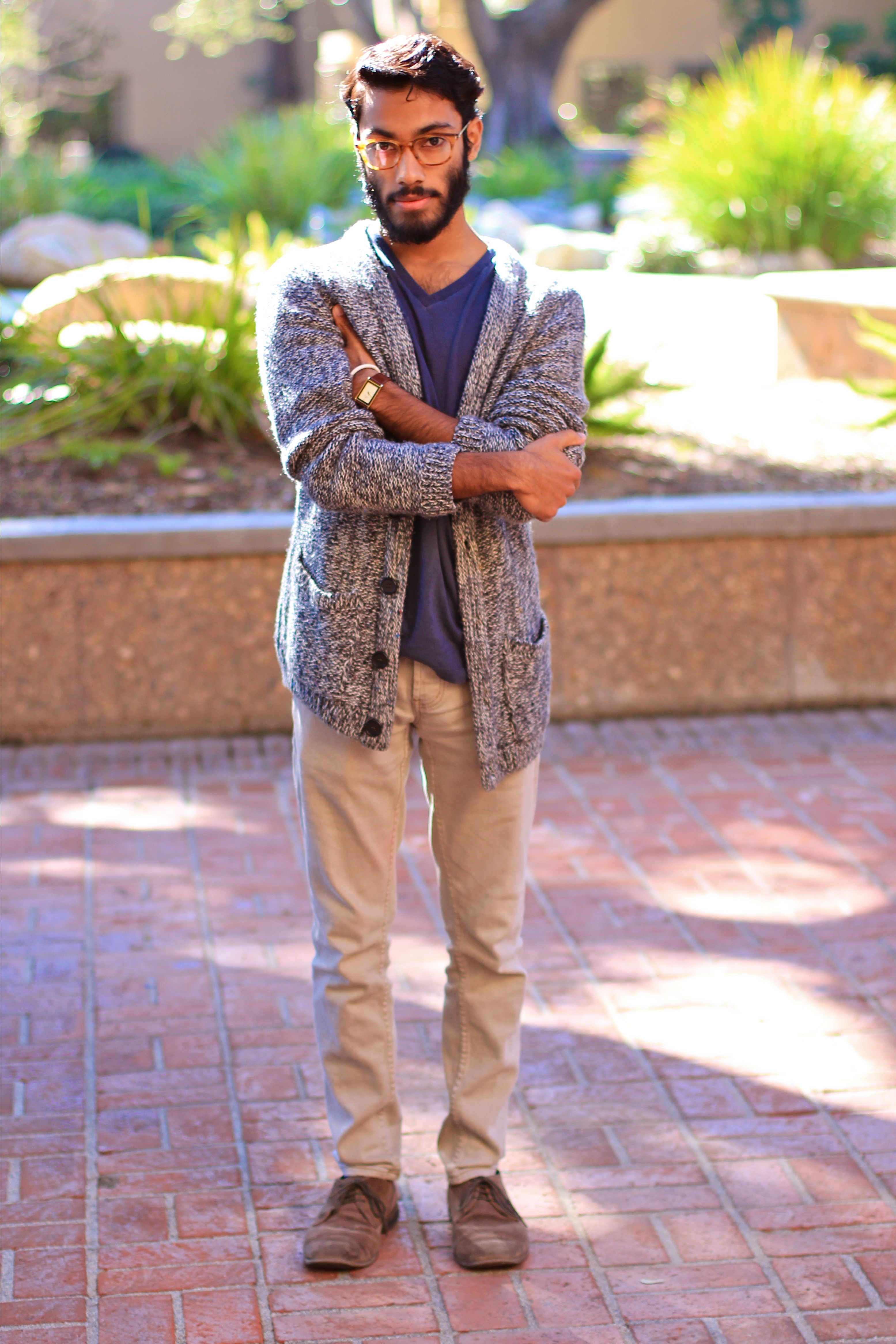 Cardigan from TopMan, V-Neck from J. Crew, Khaki Jeans from Hot Topic, Socks from H&M, Suede Shoes from Mark Anthony