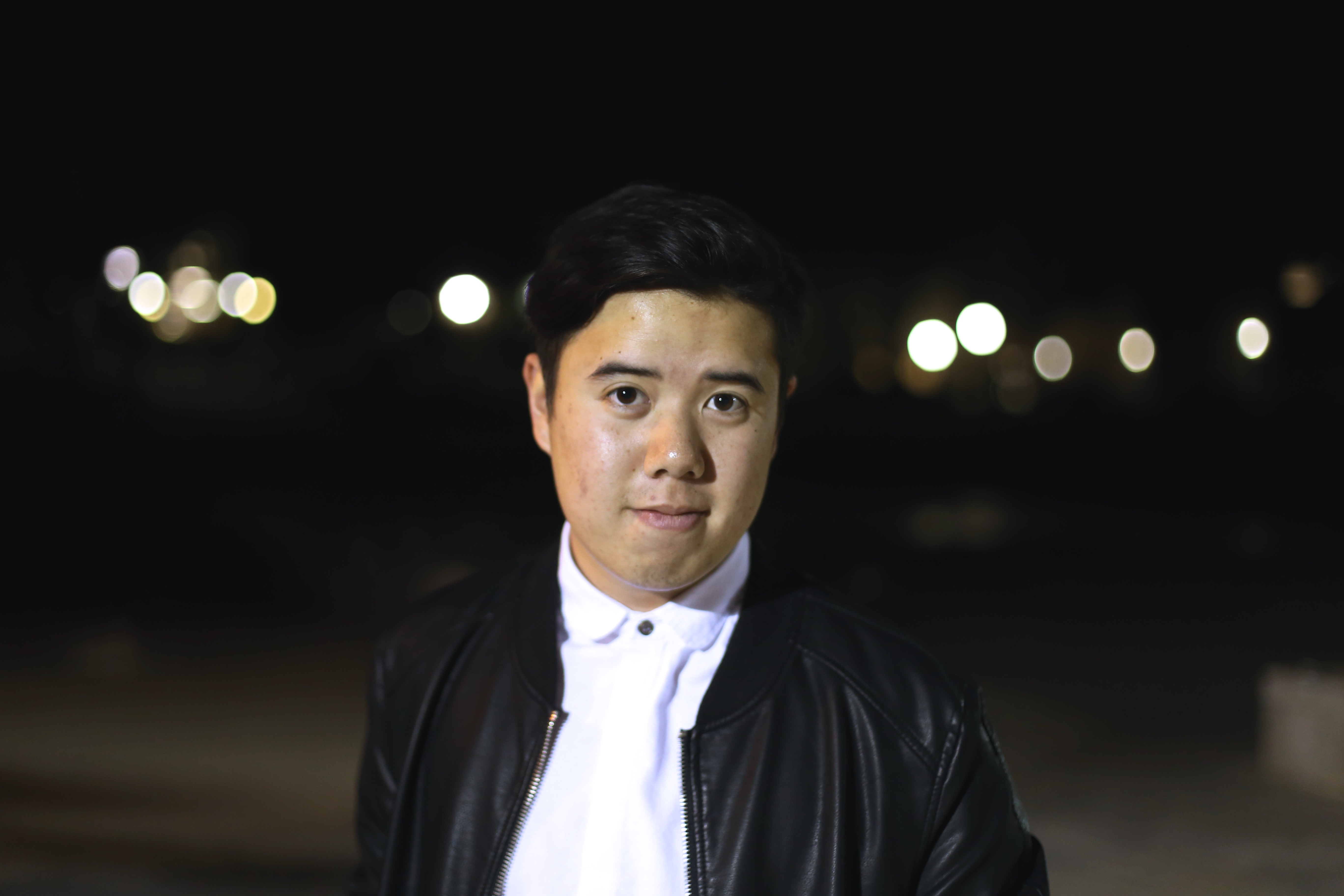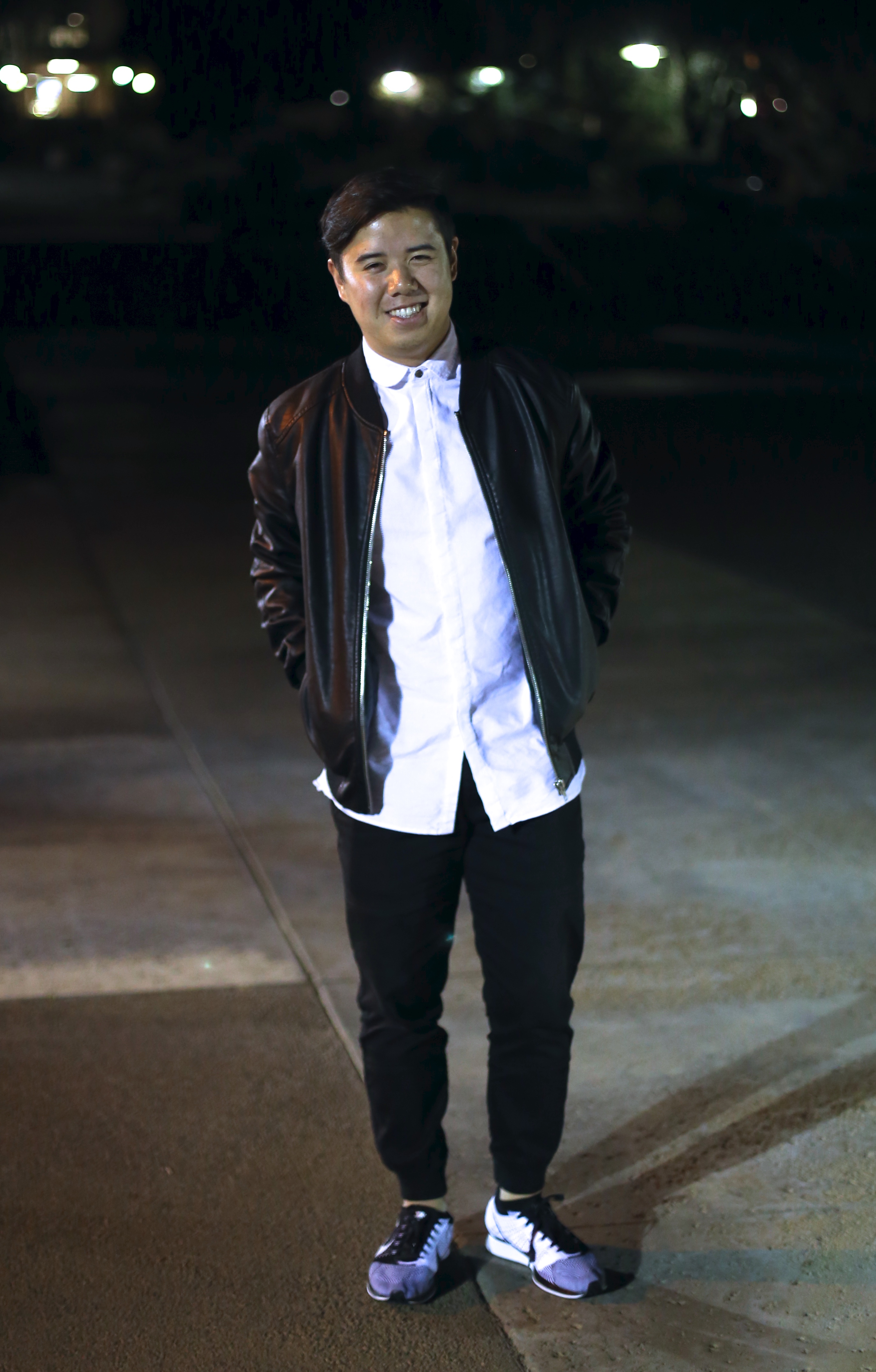 “This look is inspired by the “street goth” style, but customized to my personal tastes. The style consists of dark colors and minimalistic designs tailored to a modern, slim fit. ‘Street goth’ style can become a bit outrageous at times, so I simplify it into something that I can wear without looking like a Sith Lord. A clean, leather jacket with black jogger pants contrasted with a white long sleeve button, buttoned in the ‘air tie’ fashion.”