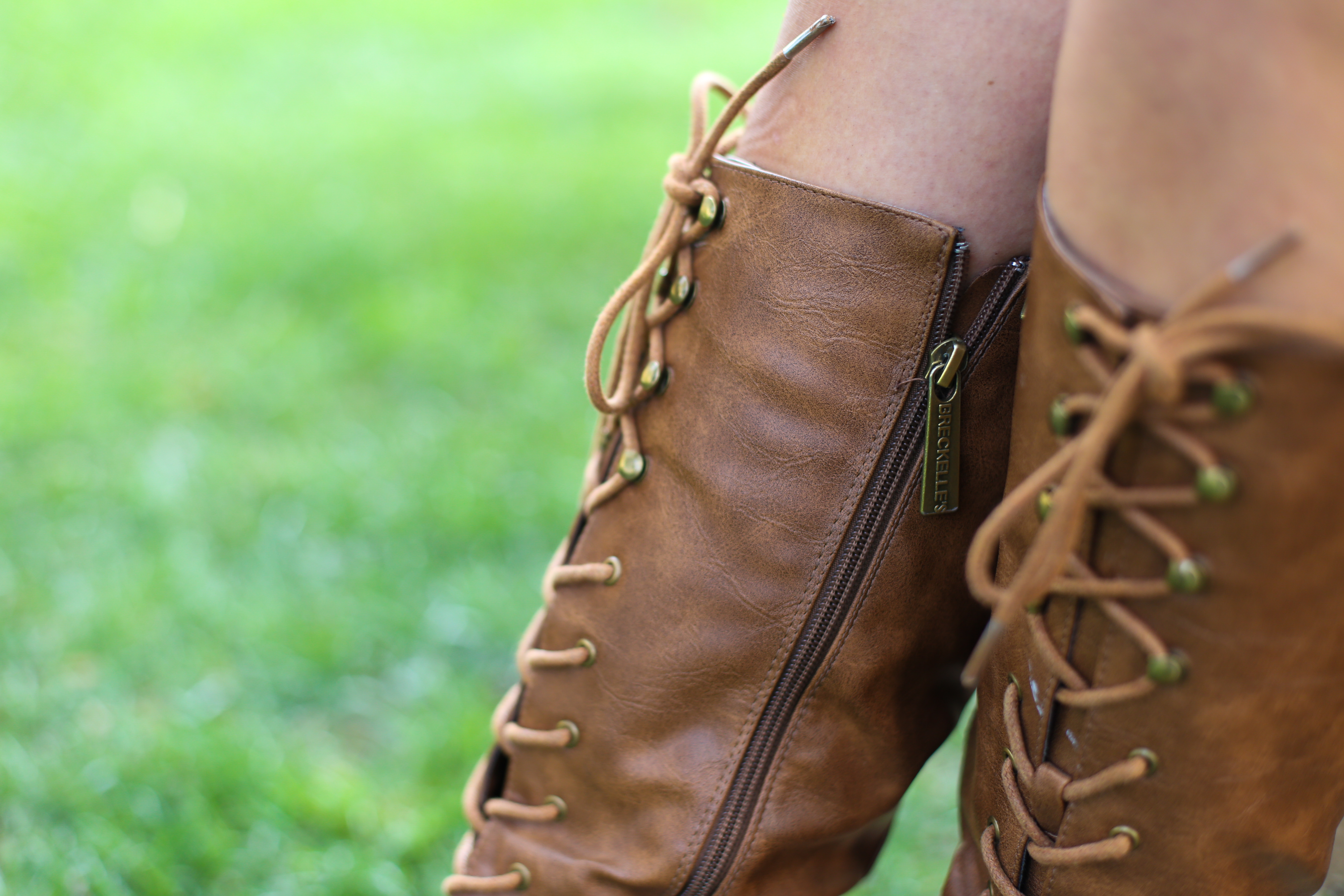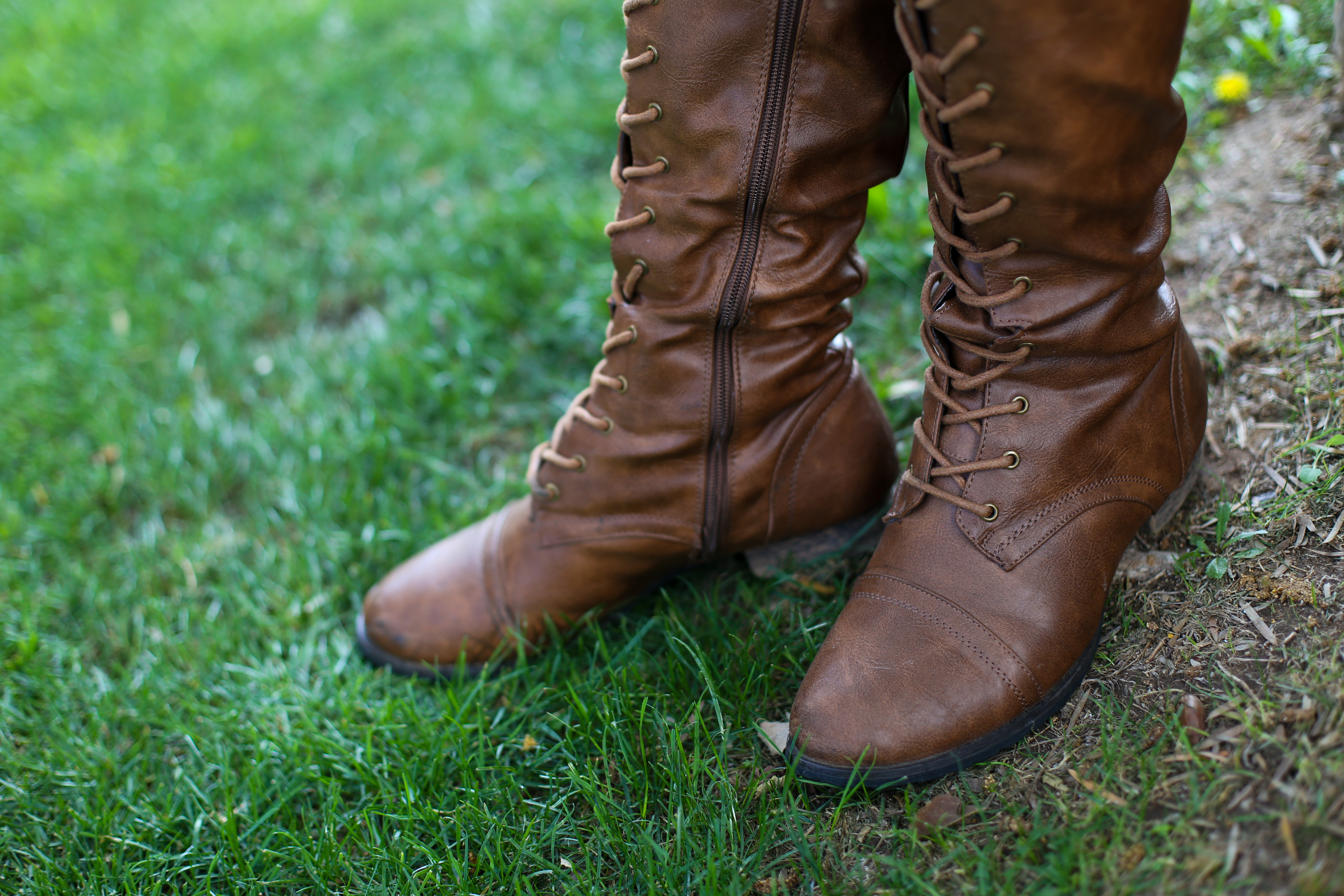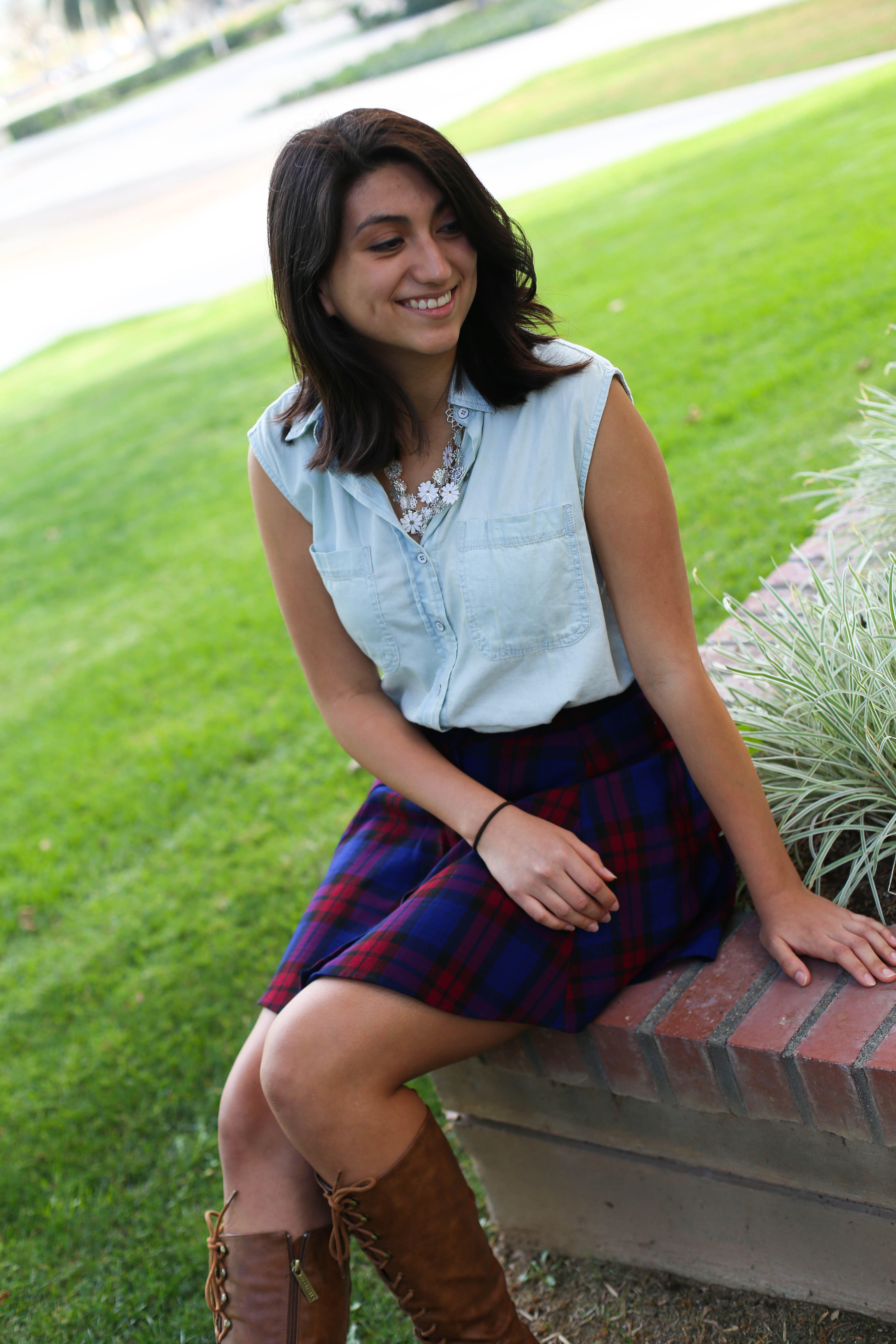 I admire the the boldness in color of her plaid skirt that contrasts, yet compliments the muted hues of her sleeveless blouse and boots. Her necklace adds a nice touch of detail as well. I’m a fan of wearing blues with browns as well, and you can see that with the addition of her boots. I like how they’re the longer cut, which balances out the length of her skirt.