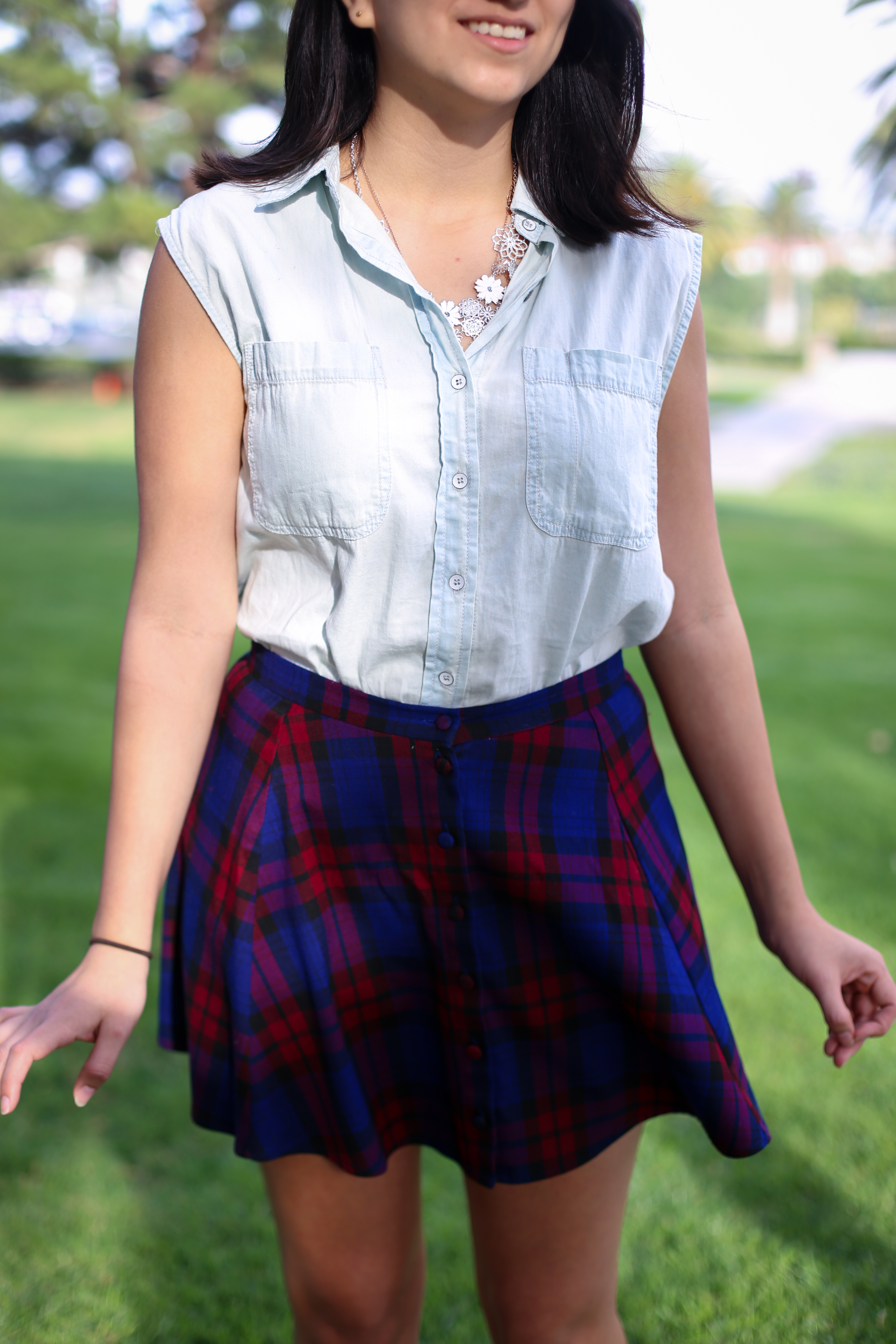 “Fashion is all about being yourself. If you’re happy, comfortable and confident, you’re fine. Dress to express, not impress. I used to wear a uniform, so the plaid skirt is really familiar to me. The chambray shirt takes it away from the preppiness of it all, but the boots put it all together.