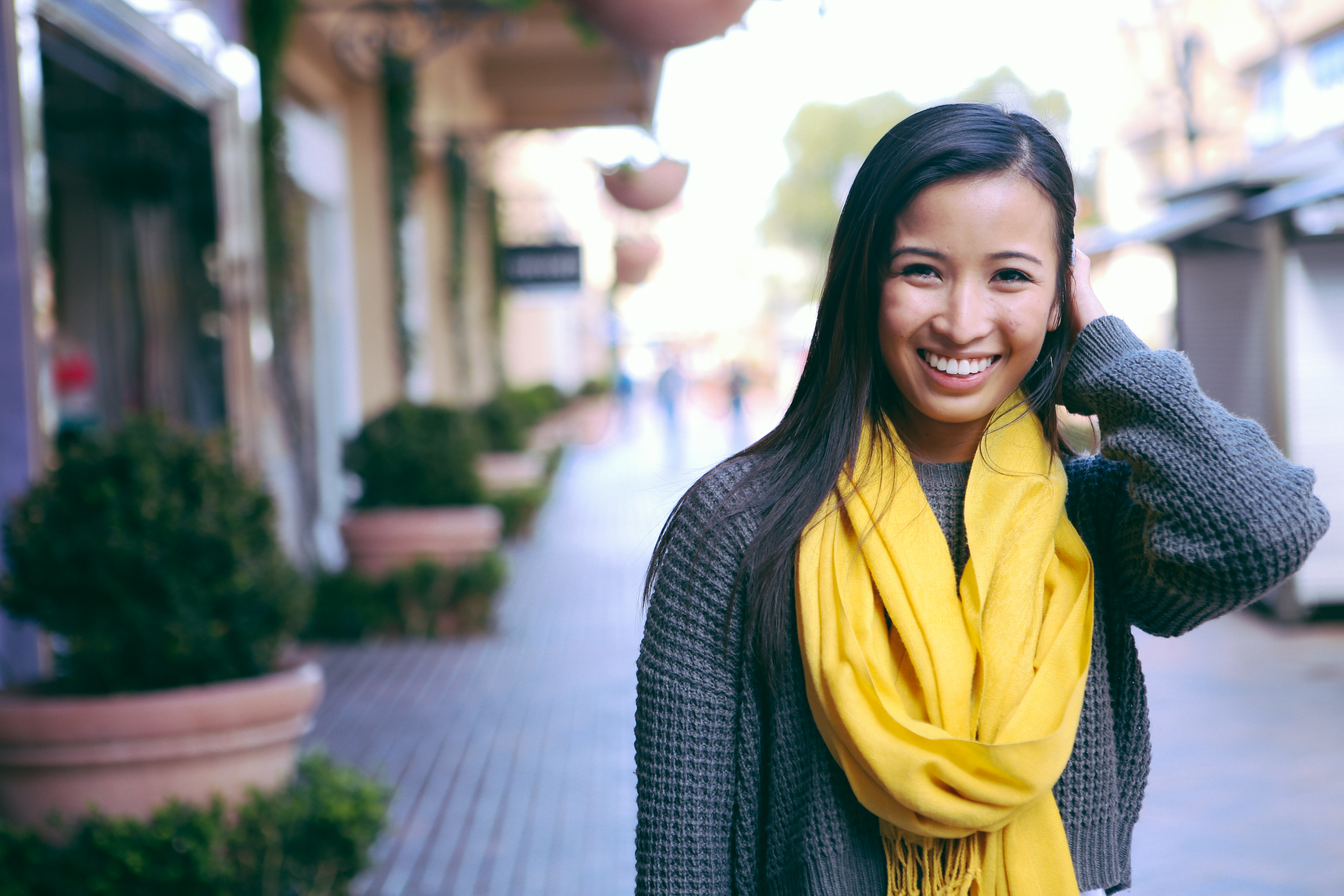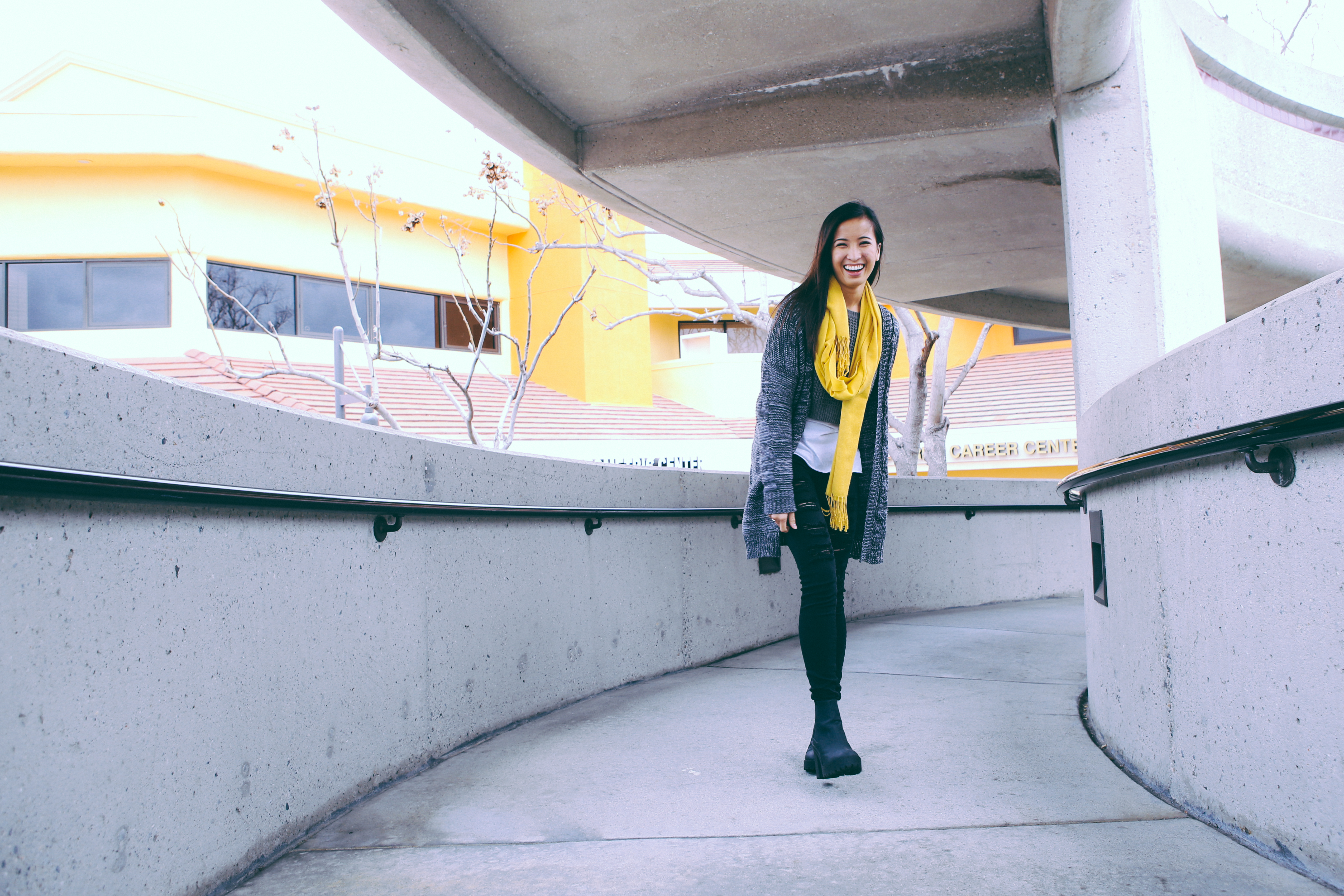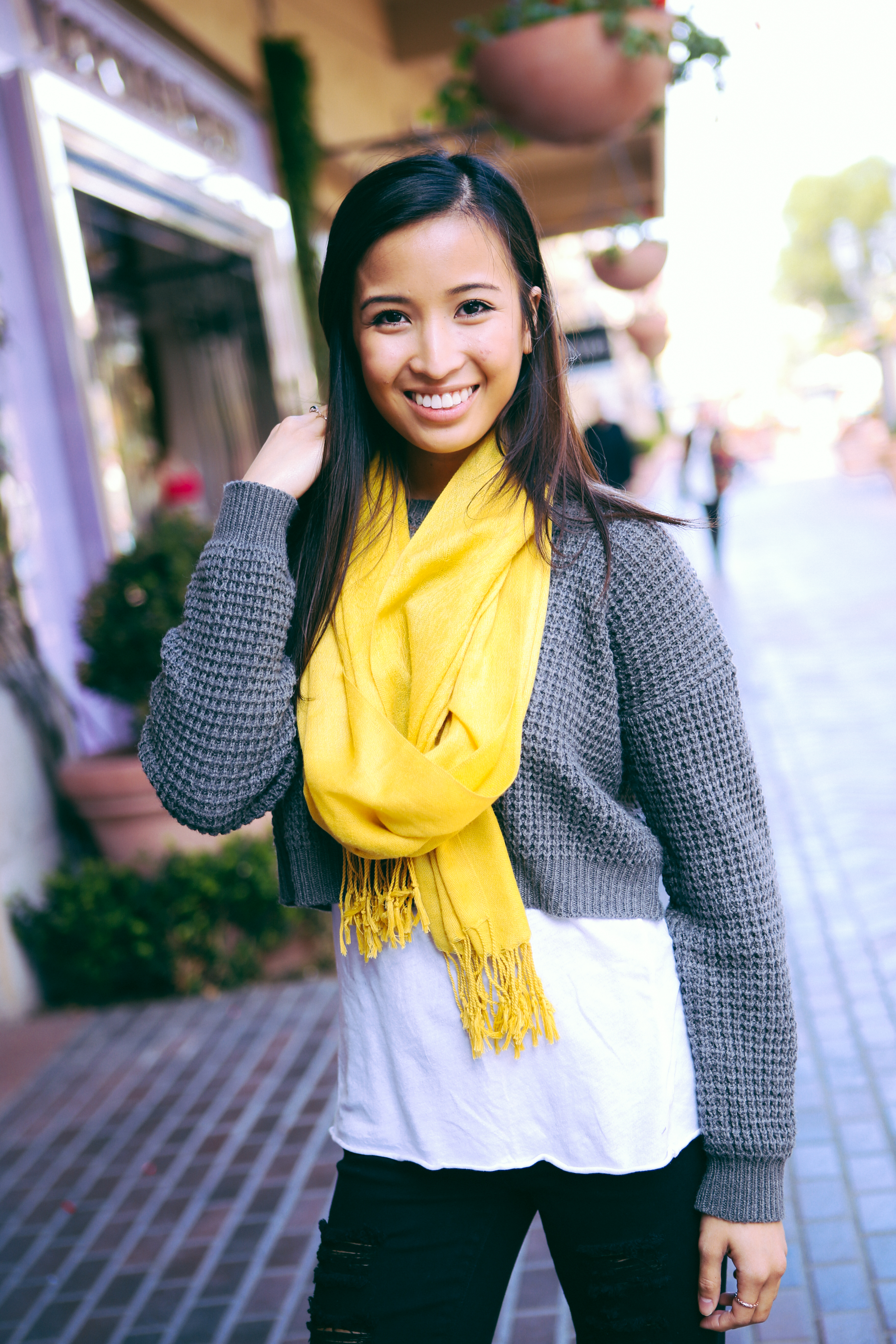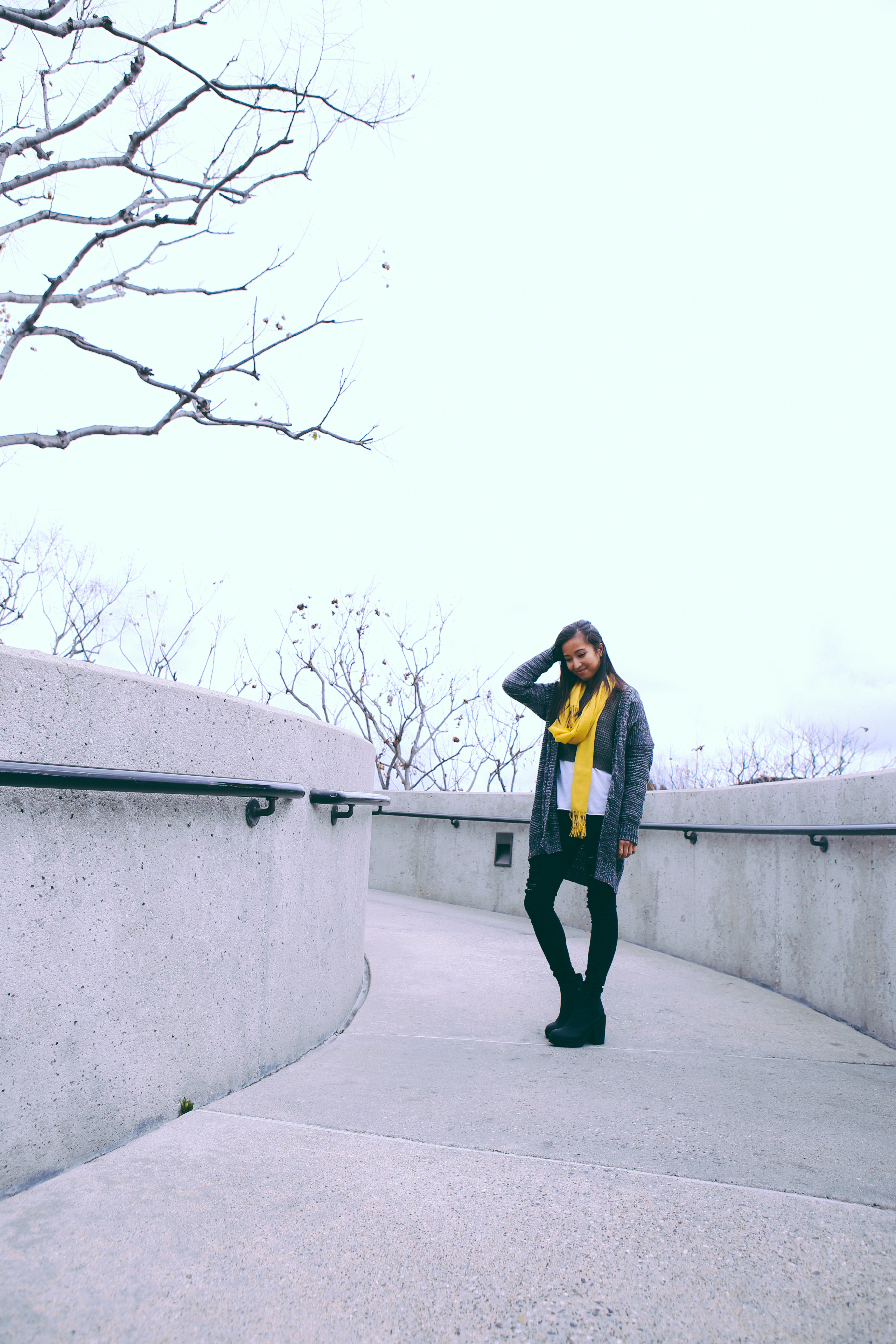 That’s why I love how Lara put together this outfit. The cropped fit of her inner sweater allows for a larger area of her white tee to come through, while the over-sized cardigan allows for variances in length compared to the other garments. She utilizes a pop of yellow in her scarf to break up the monochromatic blacks and whites, with the differences of the gray’s in her outfit also giving some nice depth and variety. I also have a current obsession with Chelsea boots, and Lara’s matte-finished heeled version works perfectly with the rest of her outfit.