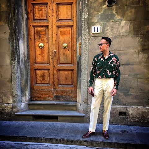 To style the shirt, I decided to go the same route as I did with the vintage sportshirts: I wore it with white summer trousers. The use of white/cream linen or cotton trousers is extremely useful, especially when you’re wearing a bold vintage shirt. You can recall that Mr. Kenji Cheung of Bryceland’s did the same thing with this patterned sport shirt. I think it works well here, which contrasts with the blue of the shirt. I honestly can’t think of any other thing tailoring wise that would work with it other than these trousers or perhaps a brown one; khaki would make it look a little boring, in my opinion. I wouldn’t recommend wearing a sportcoat with this (a blue one would work) since the shirt is bold and you’d probably want to show it off!