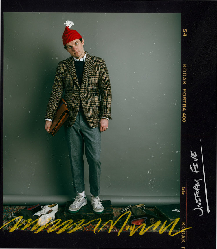 With the inclusion of a colorful (a nice green) waistcoat, it calls to mind the A/W Drake’s Lookbook from last year. It’s worn over a yellow OCBD and under a nice brown tweed from J. Crew; the latter has a lower button stance, but Spencer likes it for non-tie looks, which prevents the odd proportions from being noticed. Think of it as a tweed jacket that happens to look like a sportcoat. In the end, all of these layers and the beanie help keep him warm.