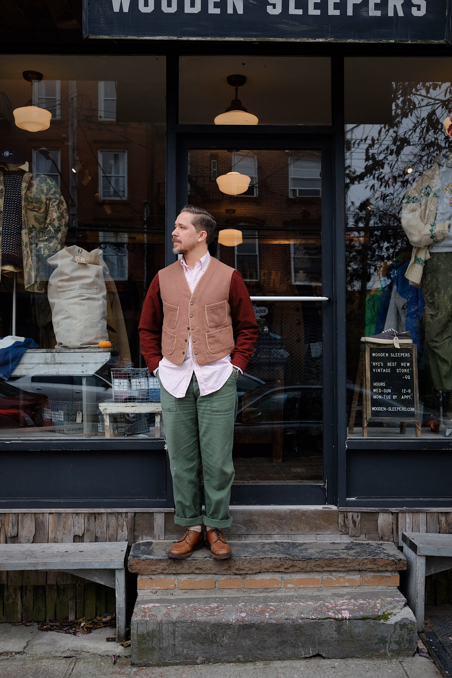 While Damian’s caps have been the main focus of his business (both custom and RTW), he has since added a new venture: reproductions. Now you can find vintage-inspired workshirts, vests, and epic Cossacks and Chimayo jackets hanging around his store. He’s constantly developing new pieces, made right into the store, which I’m always excited to see. If he ever makes a reproduction of that L.L Bean hunting vest-jacket, I’ll be his first customer.