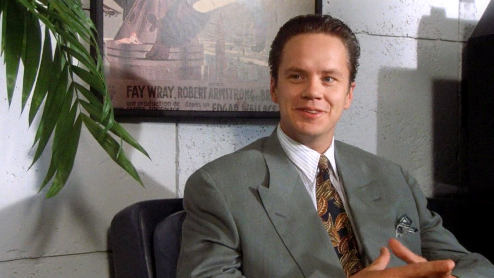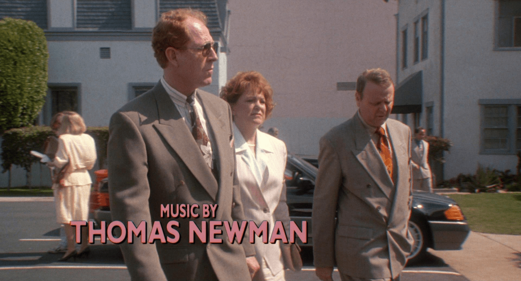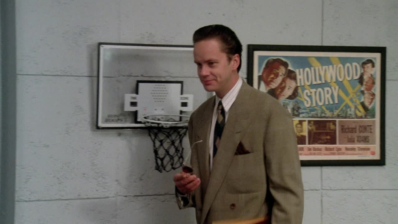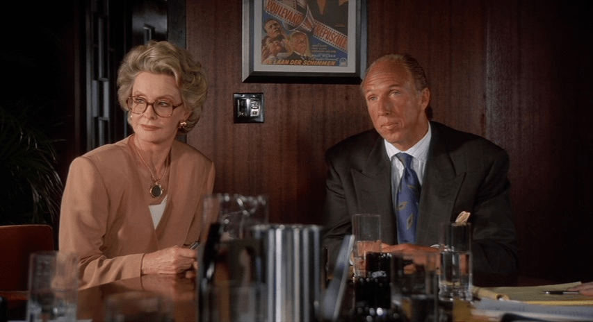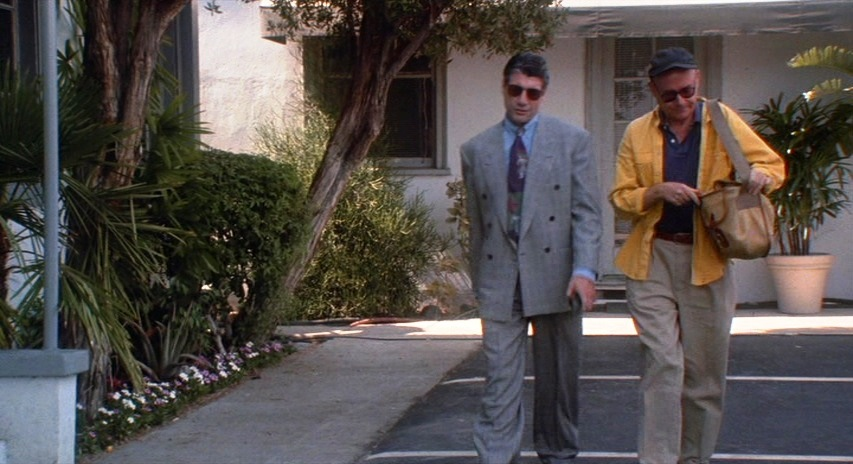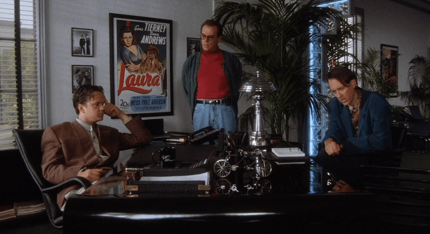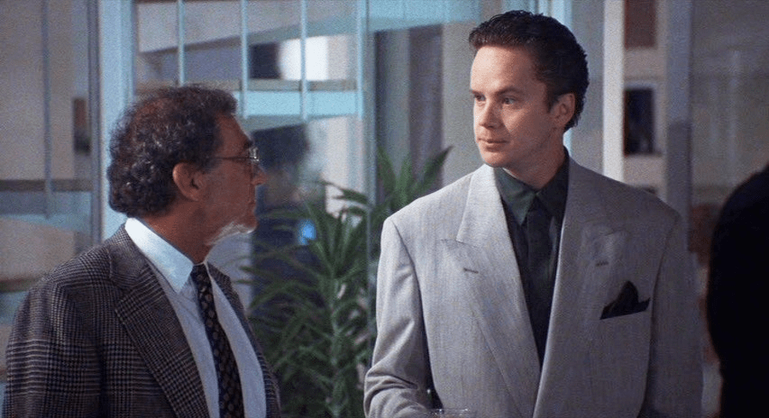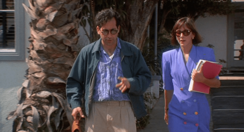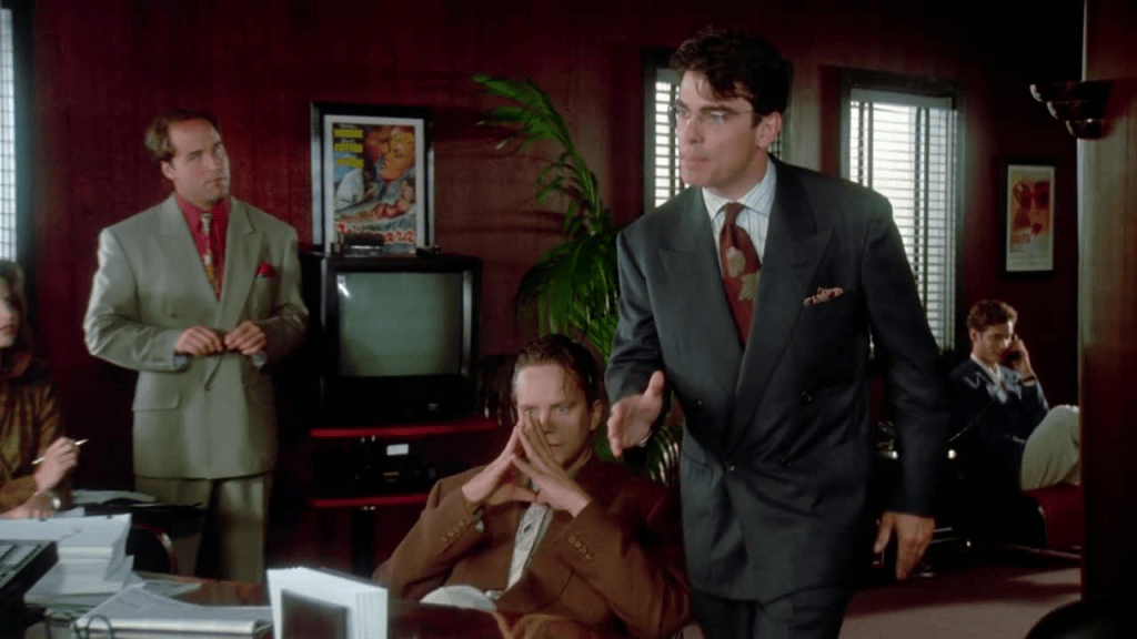 Everyone in the film is dressed pretty well, which makes sense considering its full of well-to-do execs, aspiring writers, and famous actors (playing themselves). All of the execs have the Yuppie/corporate look in spades, donning long slouchy DBs, foulard ties, striped shirts, and slick hair. It’s quite a contrast to how suits are worn today in pop culture, many of which are vibrant and very slim fit.