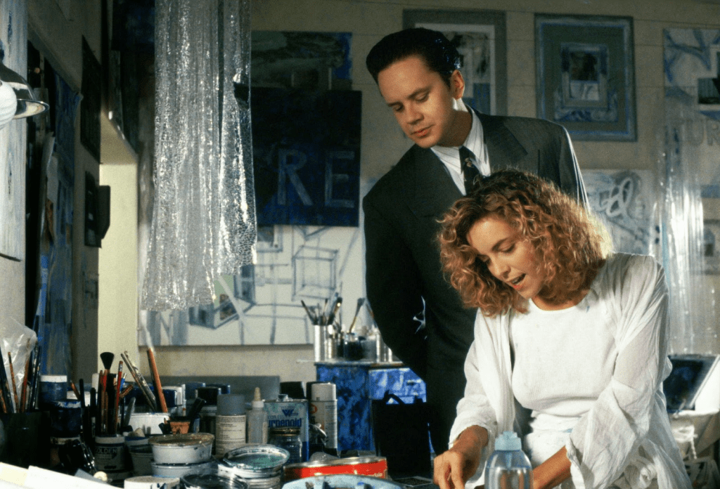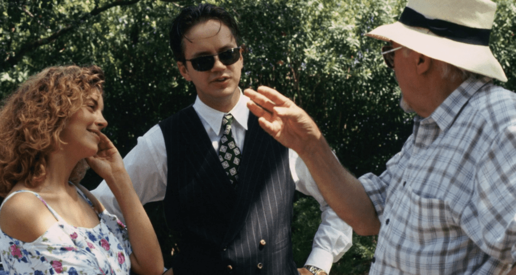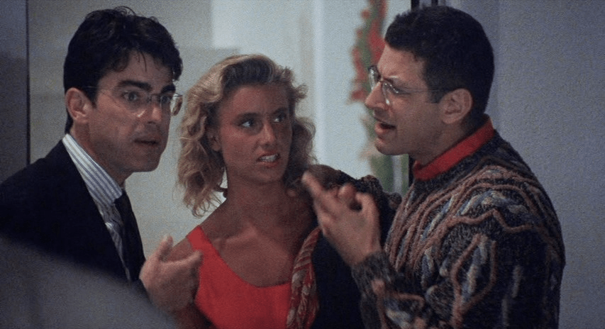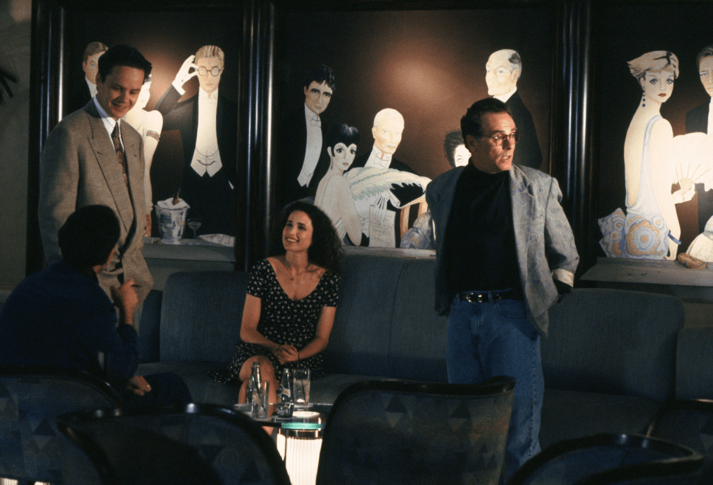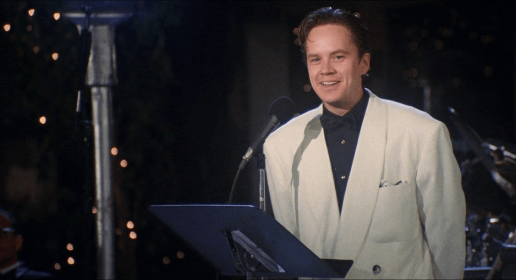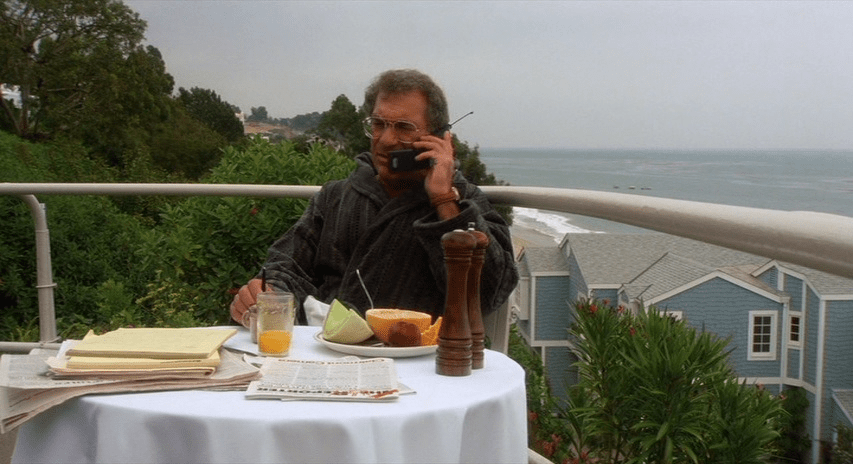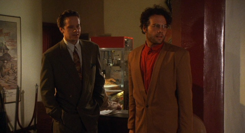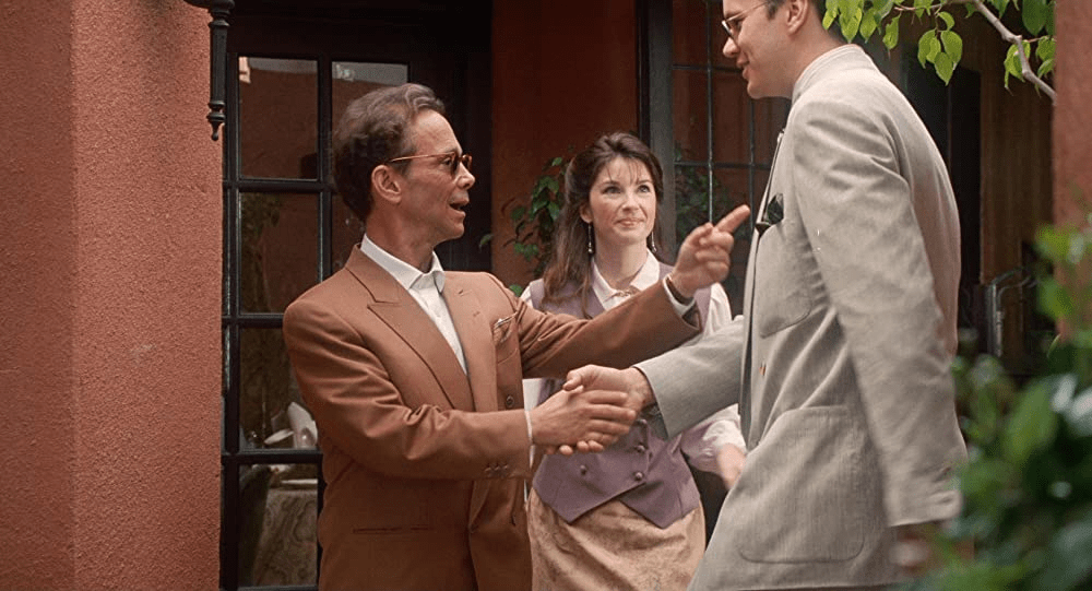 Everyone in the film is dressed pretty well, which makes sense considering its full of well-to-do execs, aspiring writers, and famous actors (playing themselves). All of the execs have the Yuppie/corporate look in spades, donning long slouchy DBs, foulard ties, striped shirts, and slick hair. It’s quite a contrast to how suits are worn today in pop culture, many of which are vibrant and very slim fit.