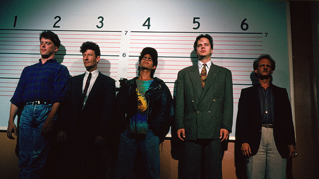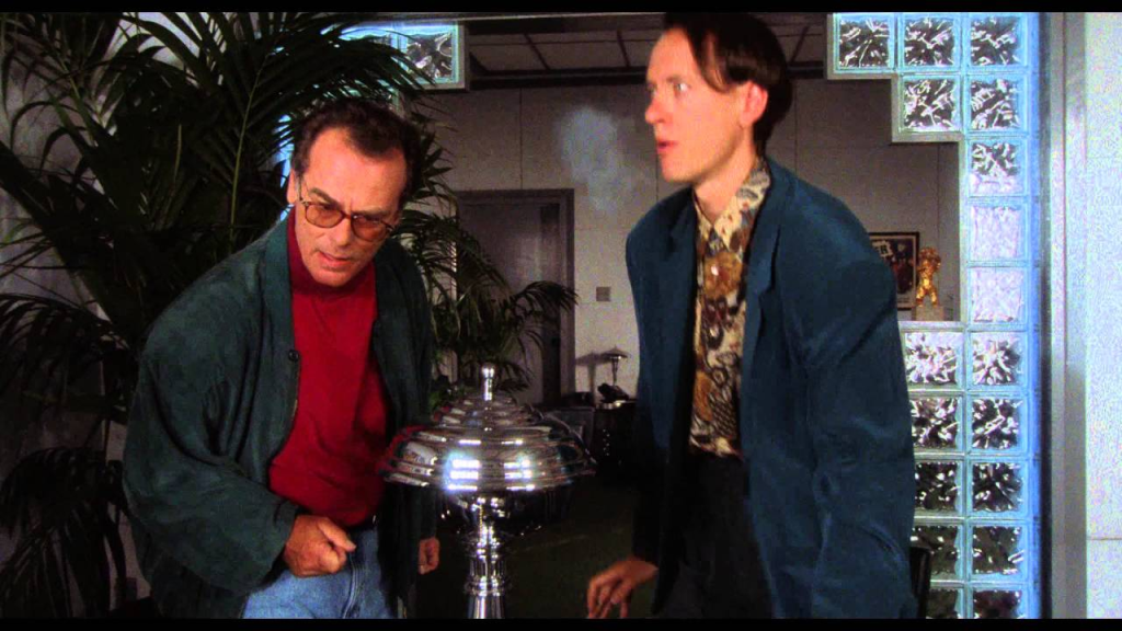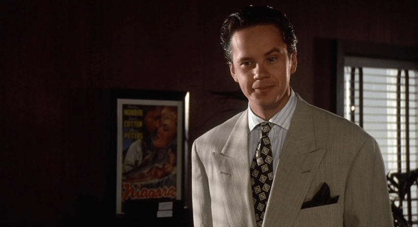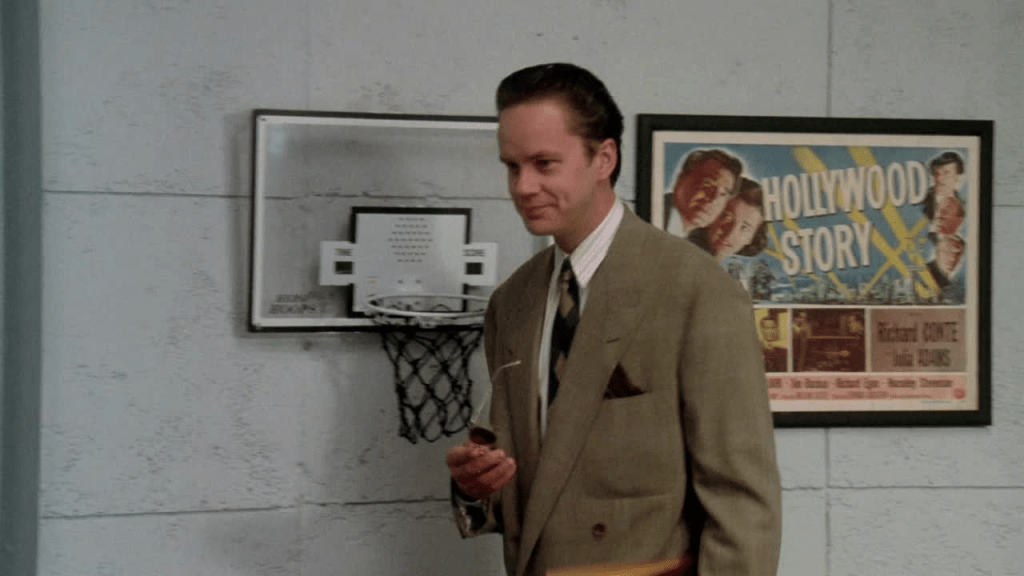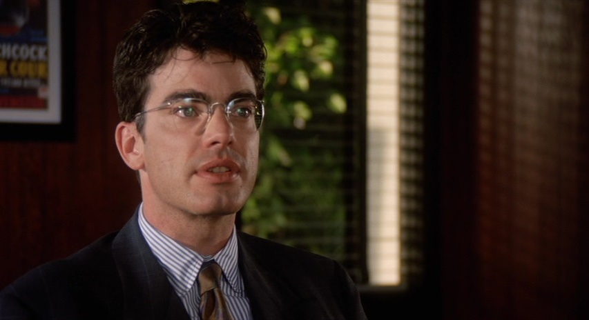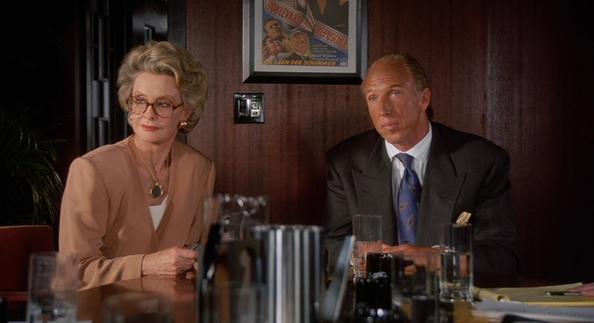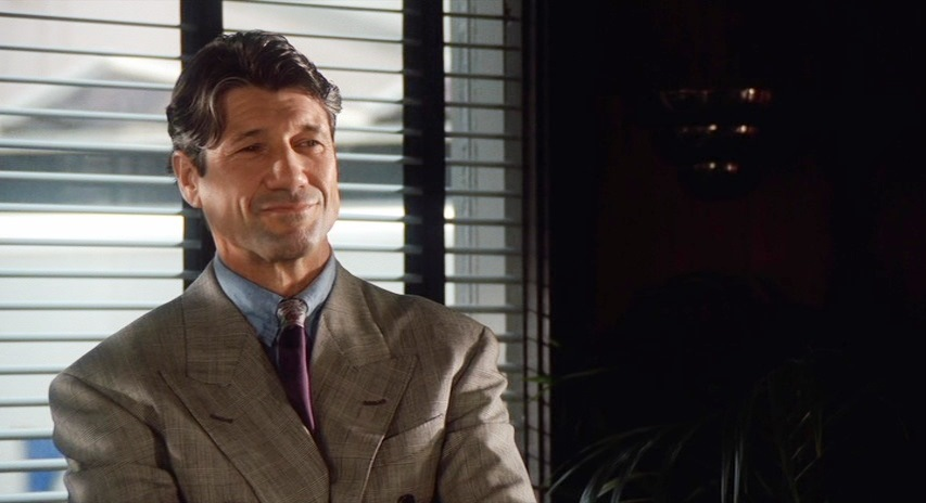 The other execs follow suit (lol) with their own DBs, multi-stripe shirts, and abstract ties. It’s always funny to see how much more interesting corporate style used to be; now we’re stuck with plain, open collar spread collar shirts and electric blue suits. While the movie is clearly very 90s, these exec “uniforms” give off an even older vibe, looking like a 90s does 40s/50s film.